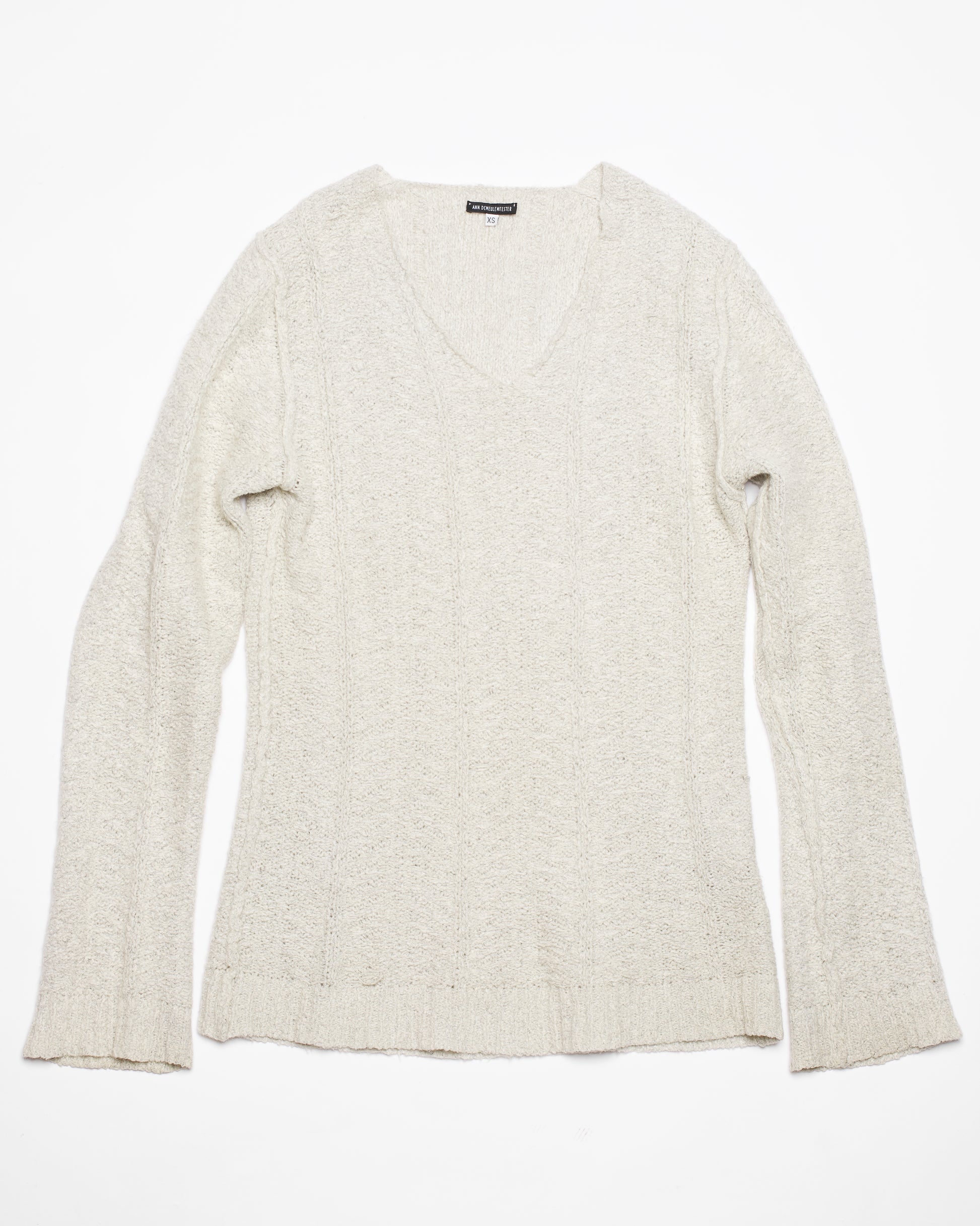 Heavyweight wool and mohair v-neck knit from Ann Demeulemeester's Autumn-Winter 2006/07 collection. A thick, warm, and elegant knit, the sweater features a deep v-neck cut and exaggerated, flared sleeves and hem.