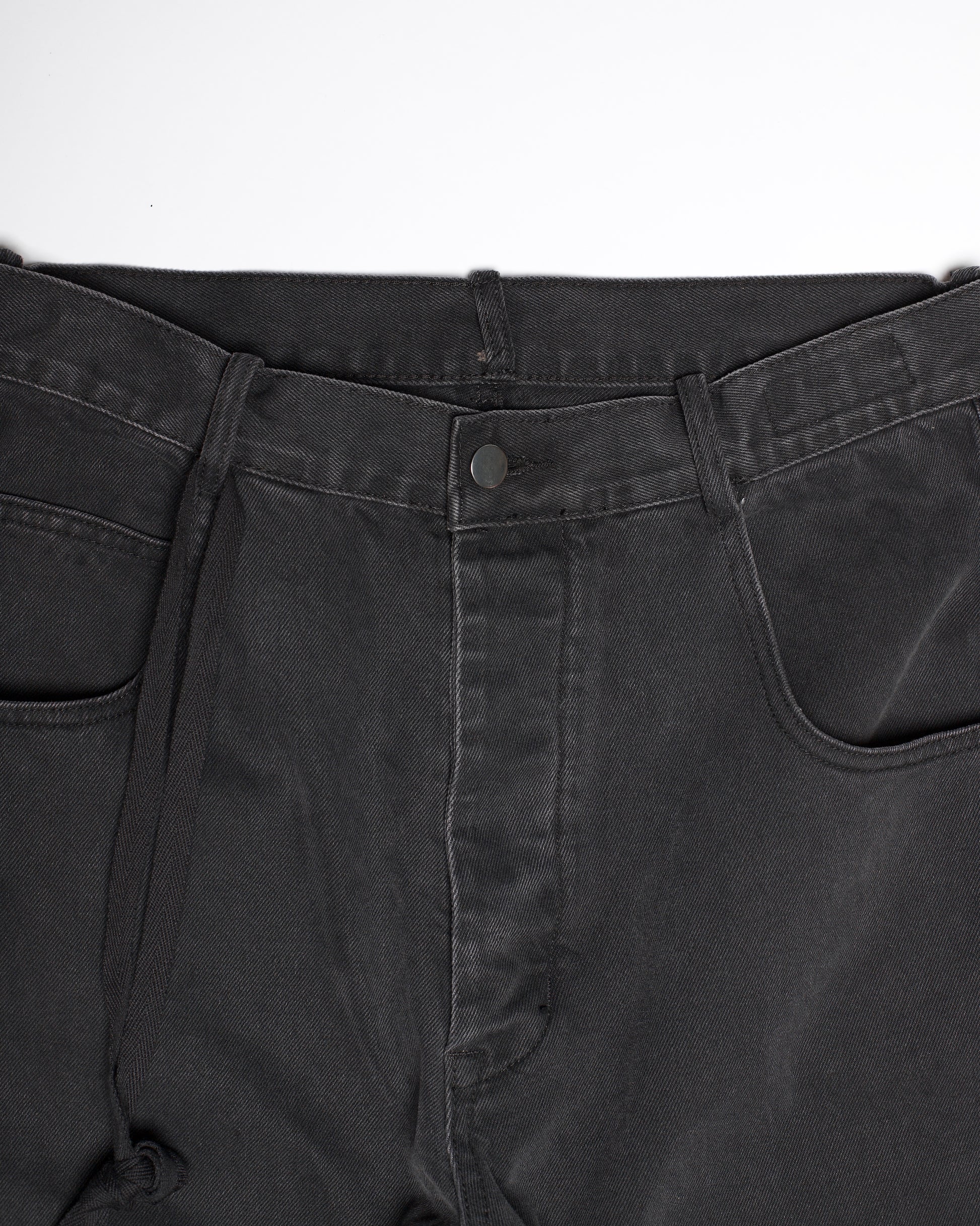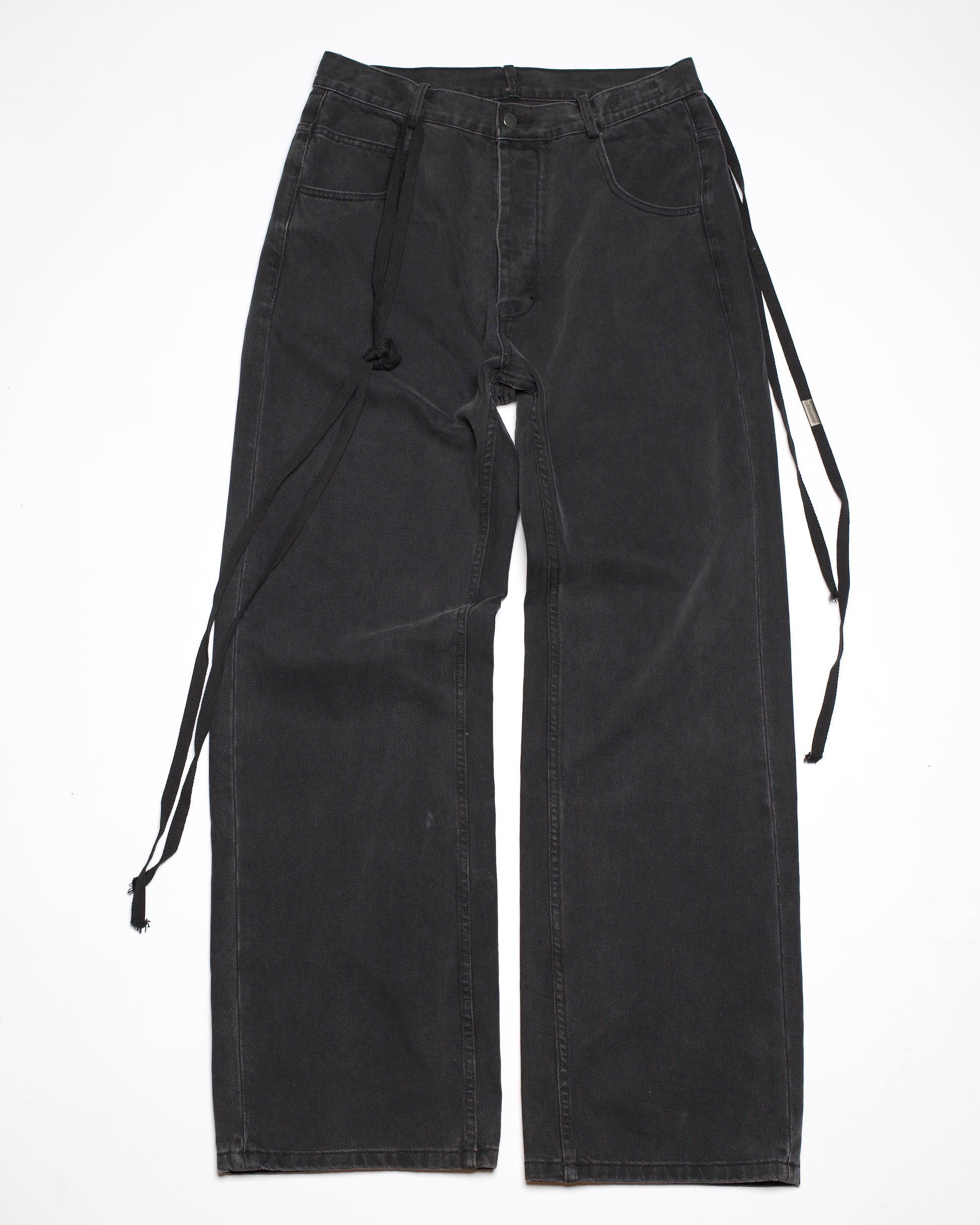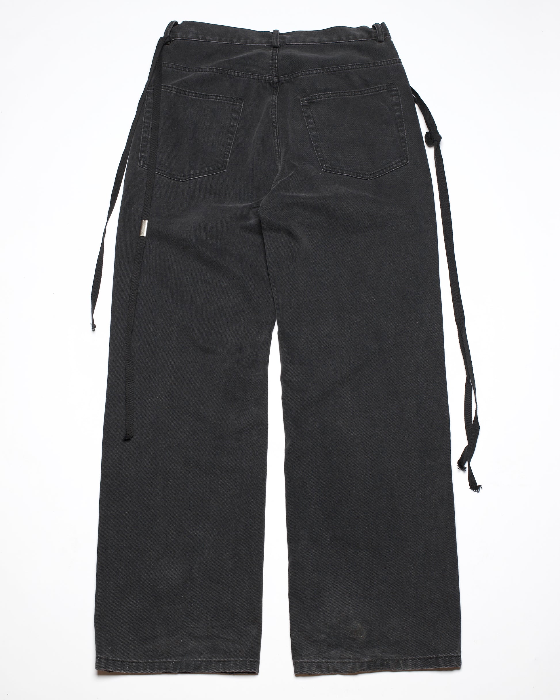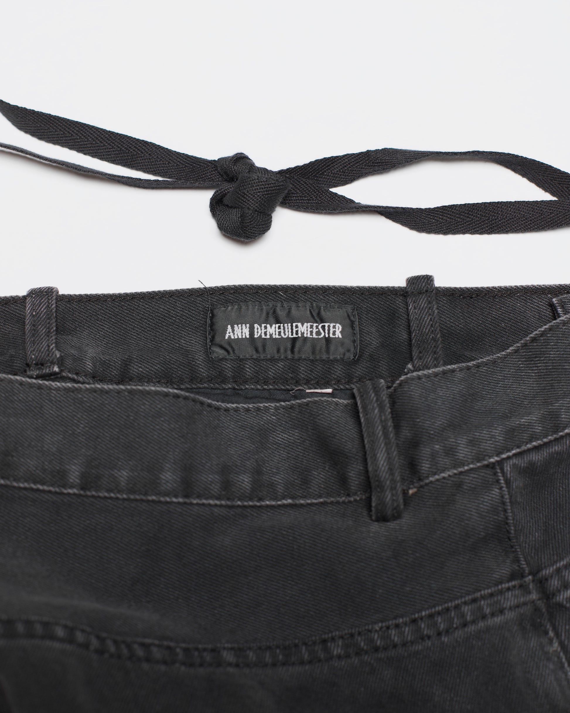 Ann Demeulemeester 5-pocket denim trousers from the Autumn-Winter 2023 collection, representative of the signature denim silhouette under director Stefano Gallici. Made in Italy from 100% cotton, the jeans are cut in an exaggerated, oversized fit, providing maximum comfort yet shapeliness. The classic five-pocket construction is refined with subtle details like custom hardware on the button fly and a removable grosgrain ribbon accent, a signature Ann touch that elevates a utilitarian silhouette.