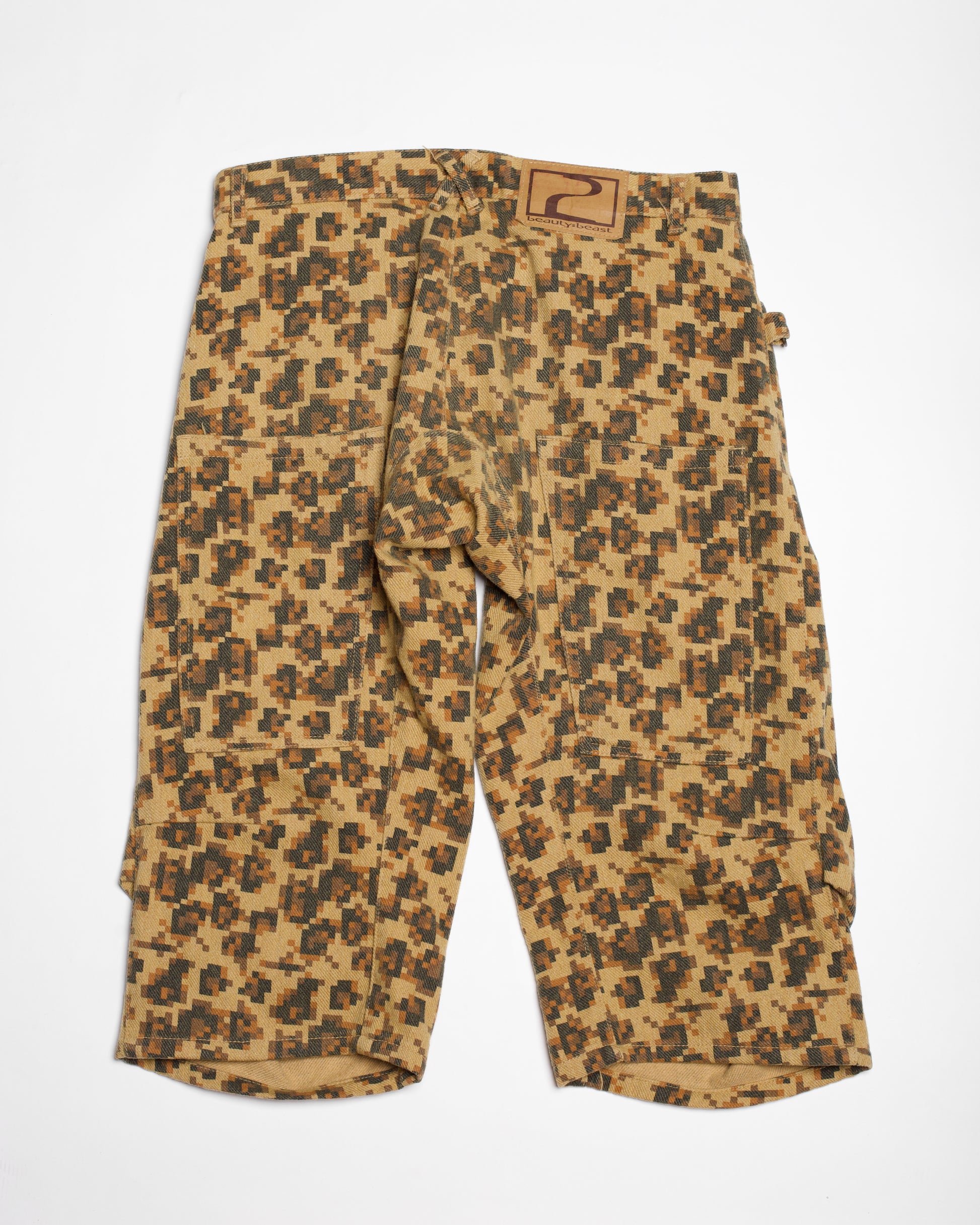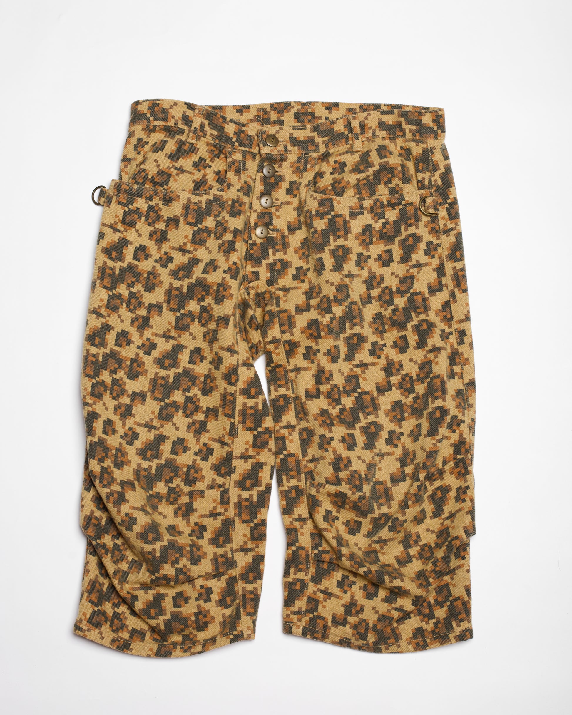 Extremely rare digital camouflage shorts from beauty:beast’s Dark Knight era, produced in the late 1990s during the brand’s greater Dark Knight output. This pair features a digitally fragmented leopard camo print. The fabric is a structured poly/wool blend, tailored in a structured silhouette that contours over the knee.