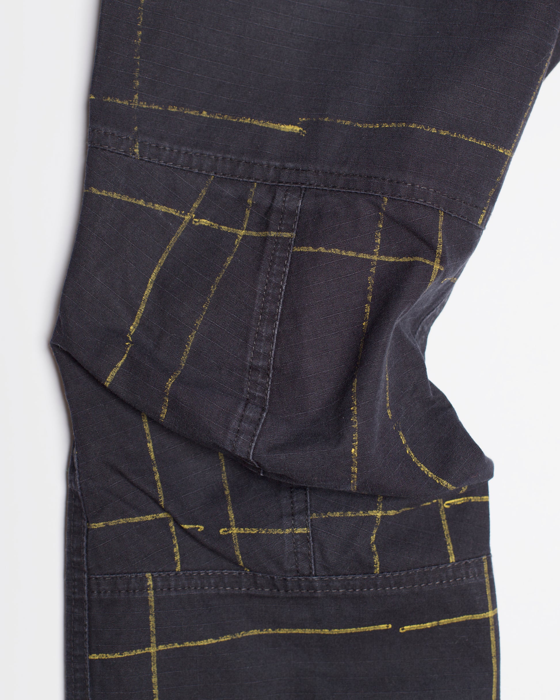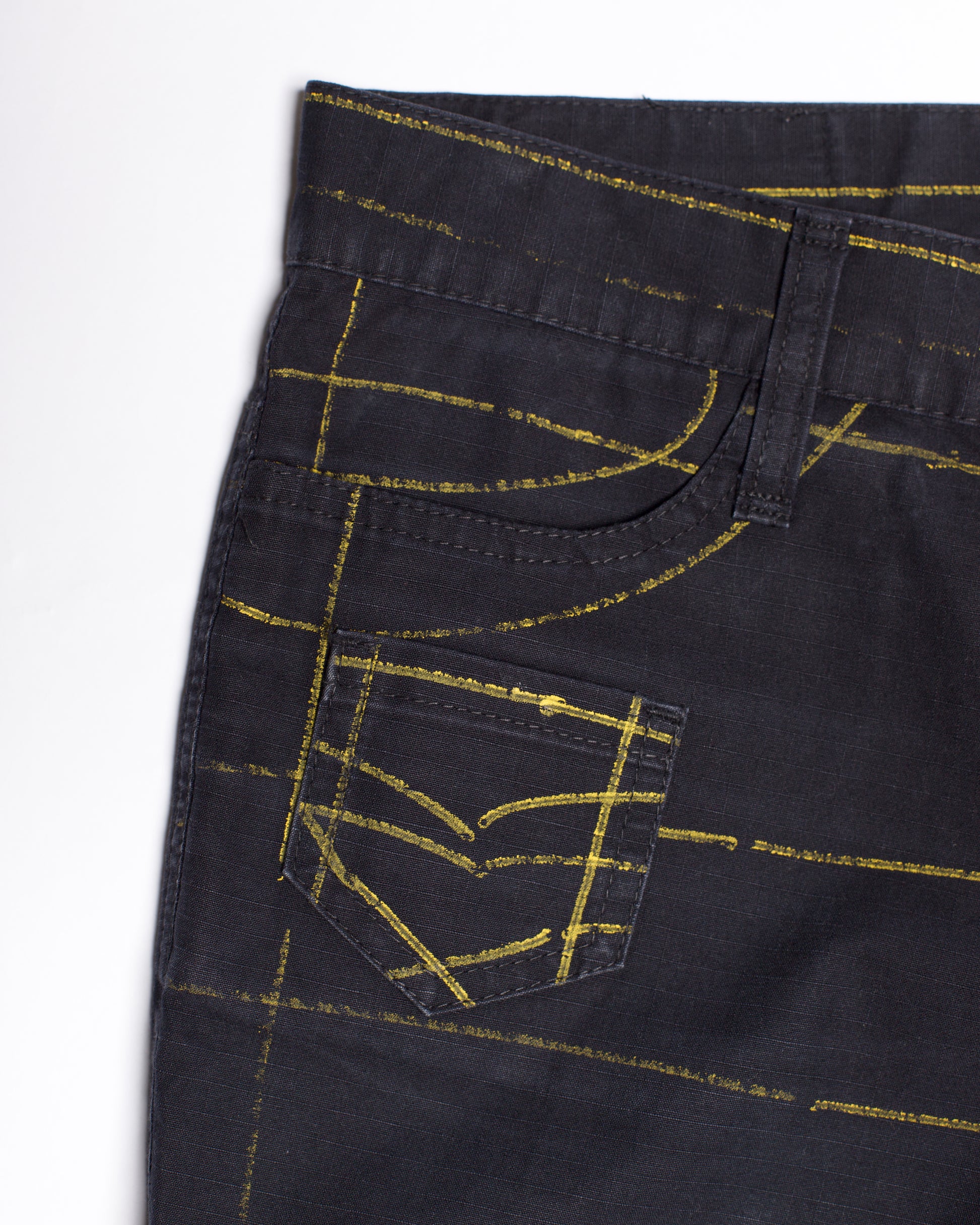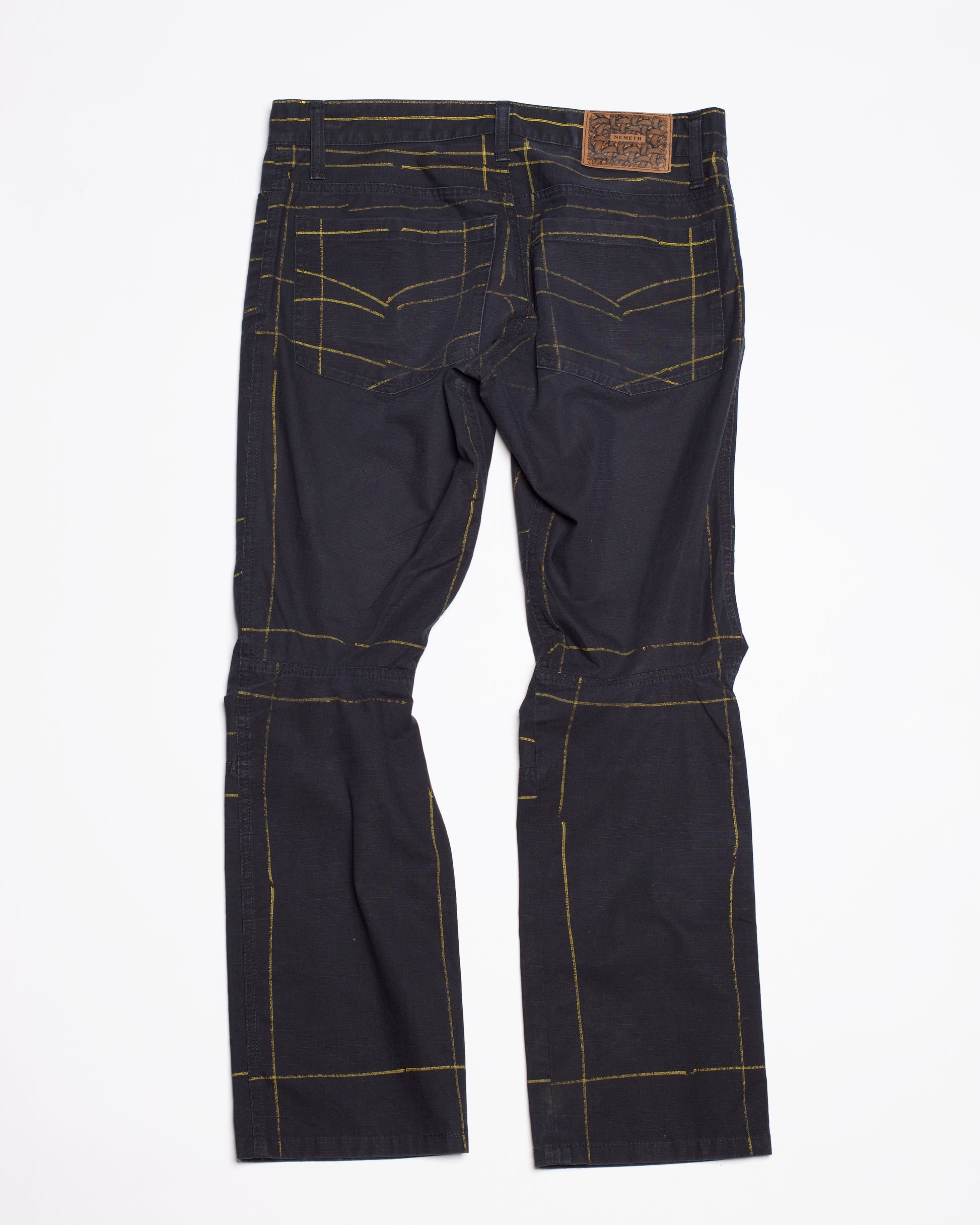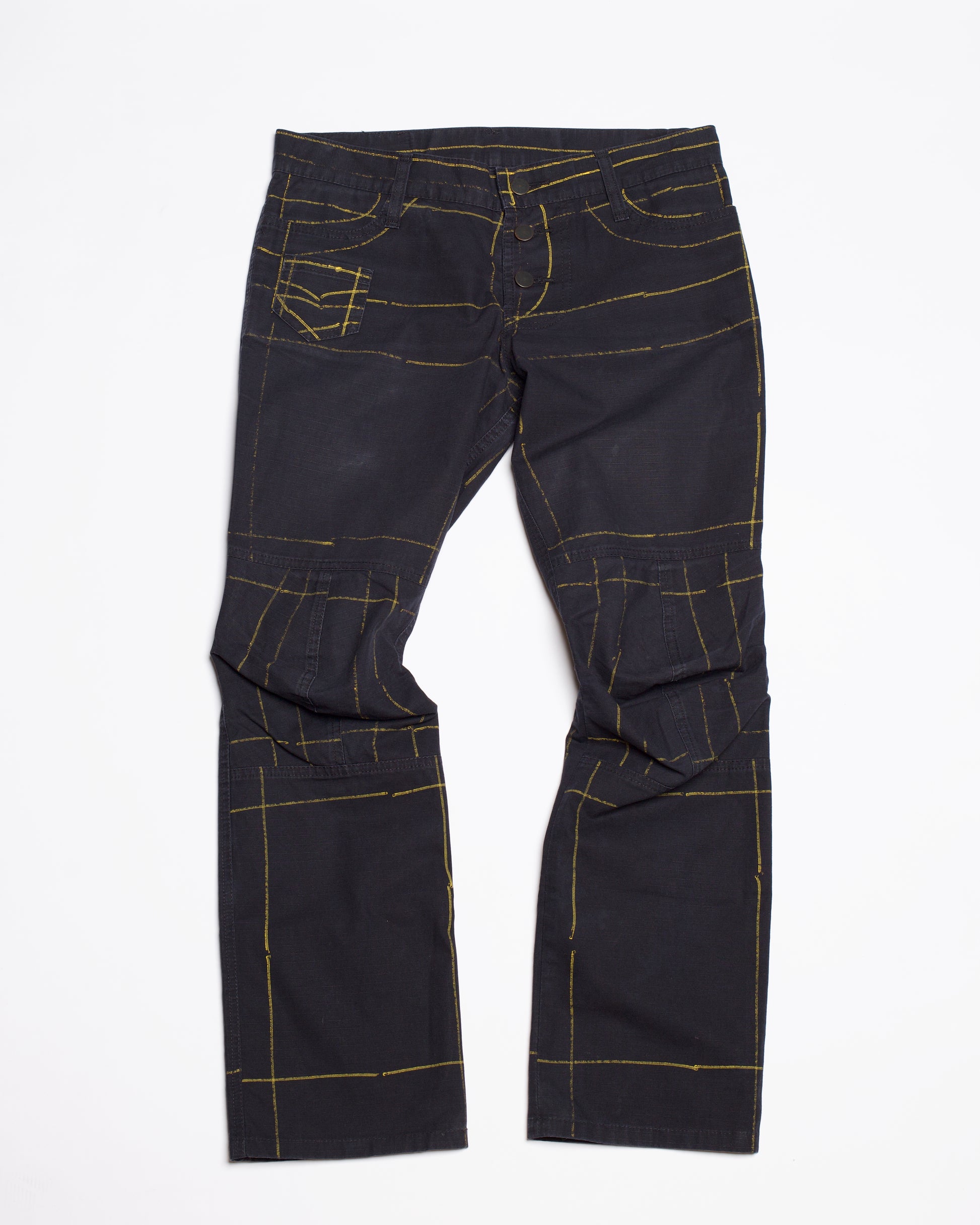 A standout piece from cult British designer Christopher Nemeth, these navy cotton trousers feature his iconic “sketch line” motif: yellow stitch-like screen-printed graphics that mimic construction lines and pattern drafting. The effect is sculptural, turning flat fabric into an illusion of three-dimensional structure. Triple-button fly closure, angled patchwork knee paneling, and a cropped, subtly flared leg reflect Nemeth’s experimental, utilitarian tailoring.