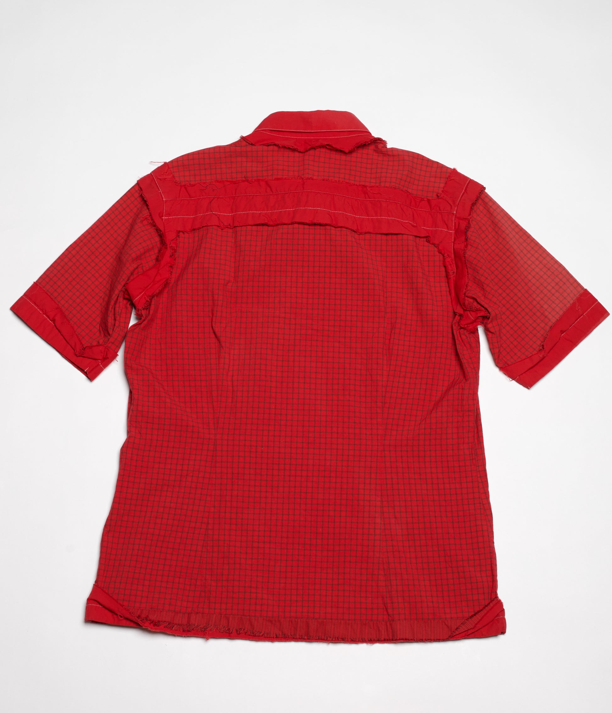 Deconstructed top by German-born, Antwerp-based designer Dirk Schönberger. Features asymmetrical seams, exposed interior elements, and frayed hems, a strong manifestation of the designers deconstructionist approach.