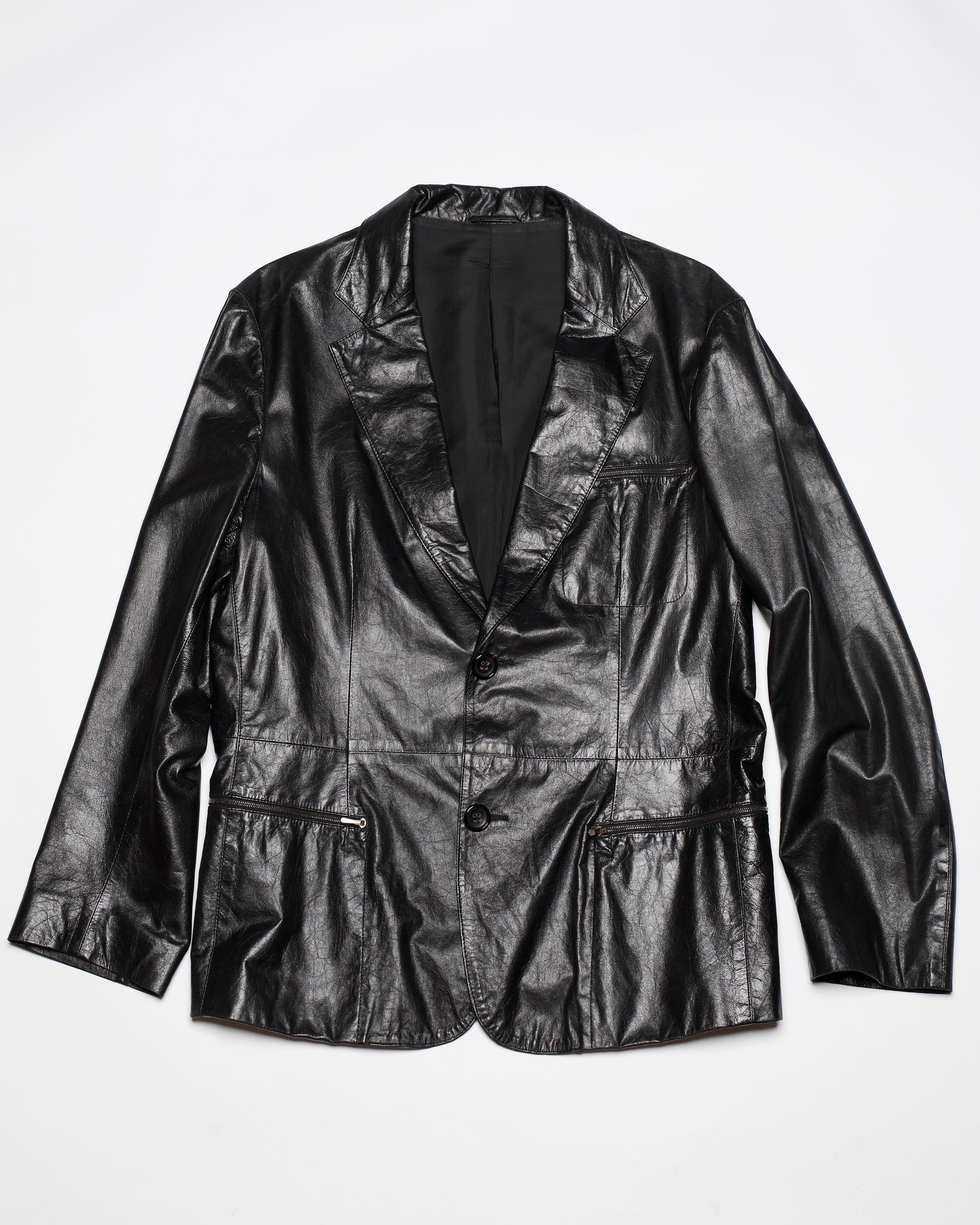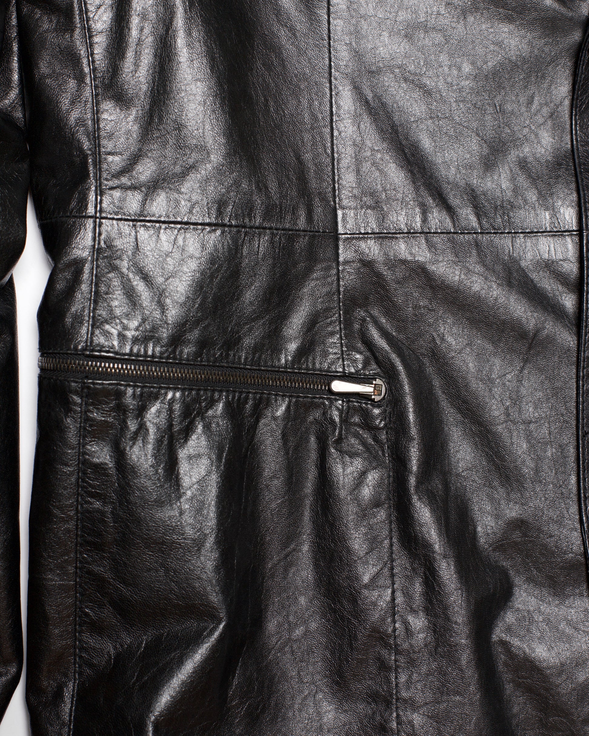 Crafted from high-quality, smooth leather that has aged gracefully, there is light fading at the shoulders, consistent with wear and adding character without compromising the garment’s structure or finish. The cut is streamlined and architectural, with a sharp lapel and subtle shaping through the body. Industrial, zippered pockets front pockets give the jacket a slightly aggressive, but mature, tone.