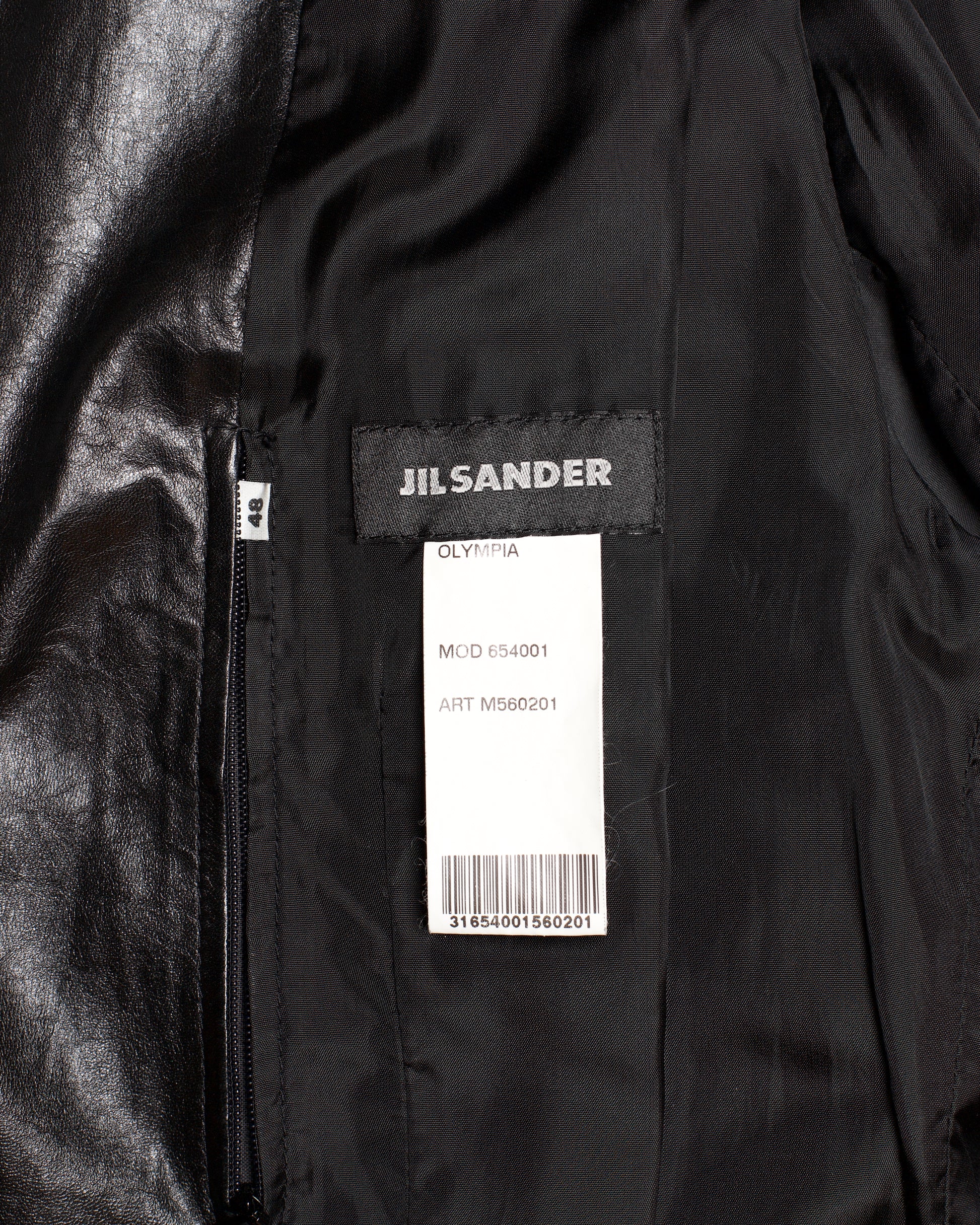 Beautiful and rare two-button leather blazer from Raf Simons’ influential tenure at Jil Sander. Likely dating from the mid to late-2000s, this piece exemplifies the refined minimalism and precise tailoring that defined the house during his direction.