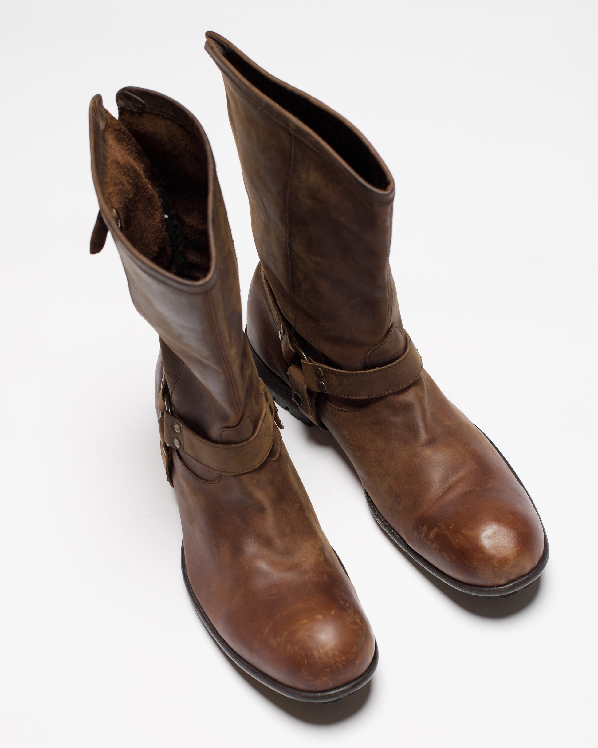 Kyoji Maruyama hand-crafted leather engineer boots, representing the pinnacle of Japanese cobbling precision from the underground Japanese designer. Features a three way harness that runs under each sole, these artfully weathered boots are the perfect example of Maruyama's long-running footwear creations.