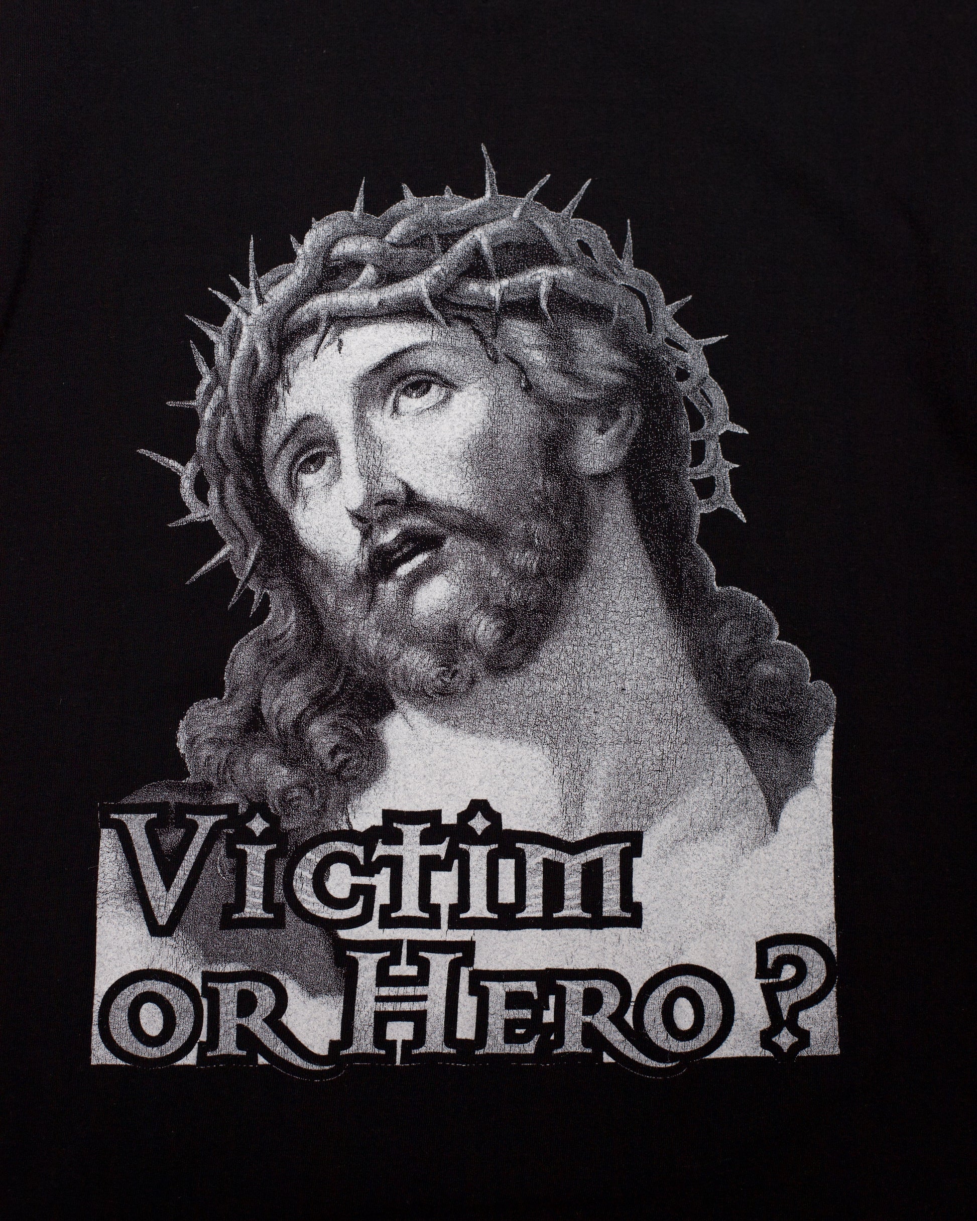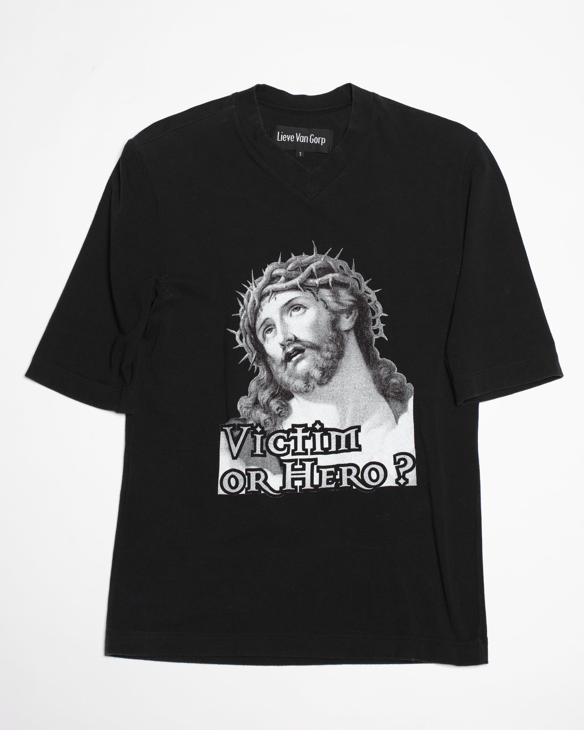 Rare v-neck graphic top from Belgian designer Lieve Van Gorp’s influential Autumn-Winter 1998/99 collection. Part of her subversive, rock n' roll infused early work, the collection features a motif of the phrase “Victim or Hero?” printed over various controversial cultural figures such as Jesus Christ, Che Guevara, and Patty Hearst.