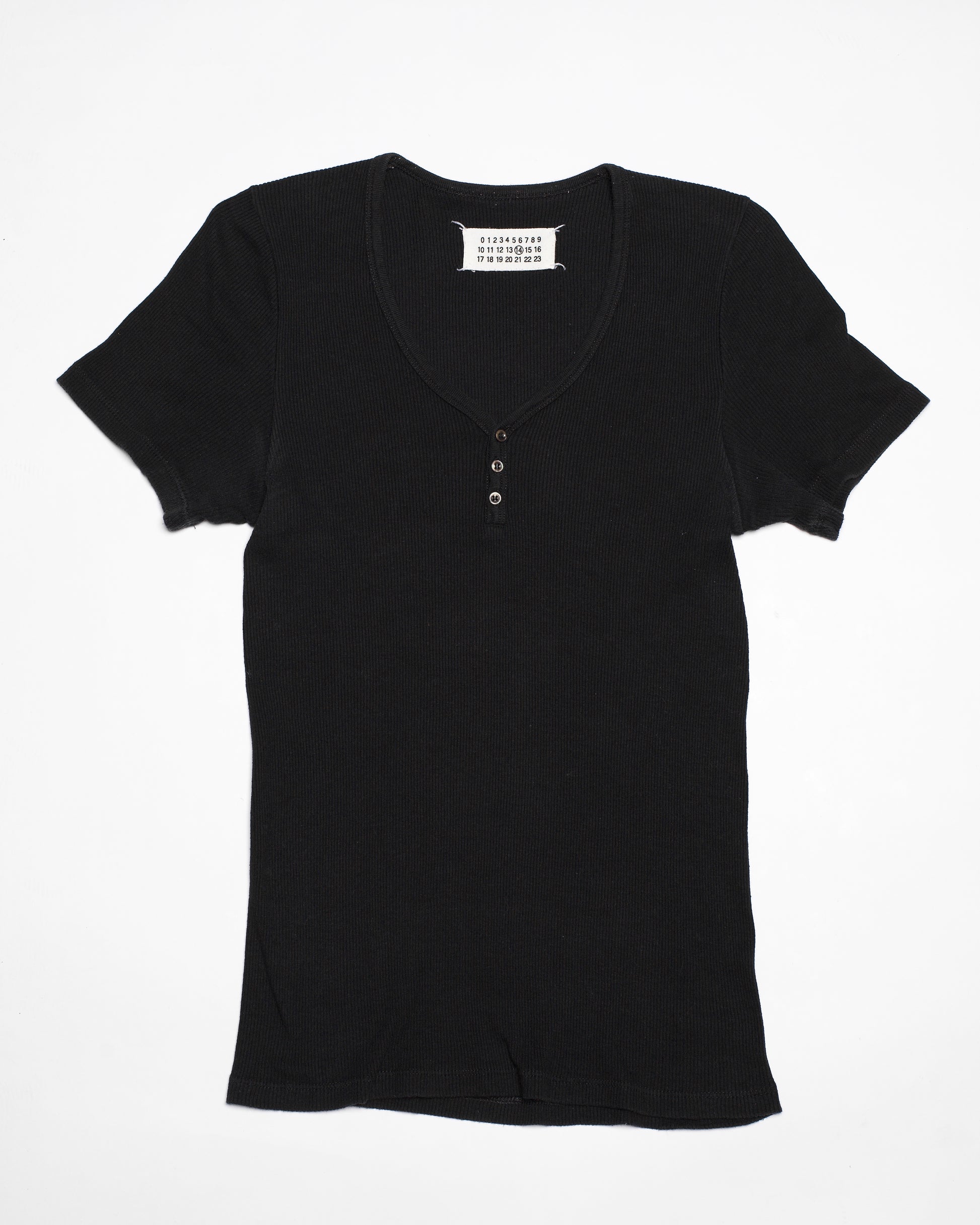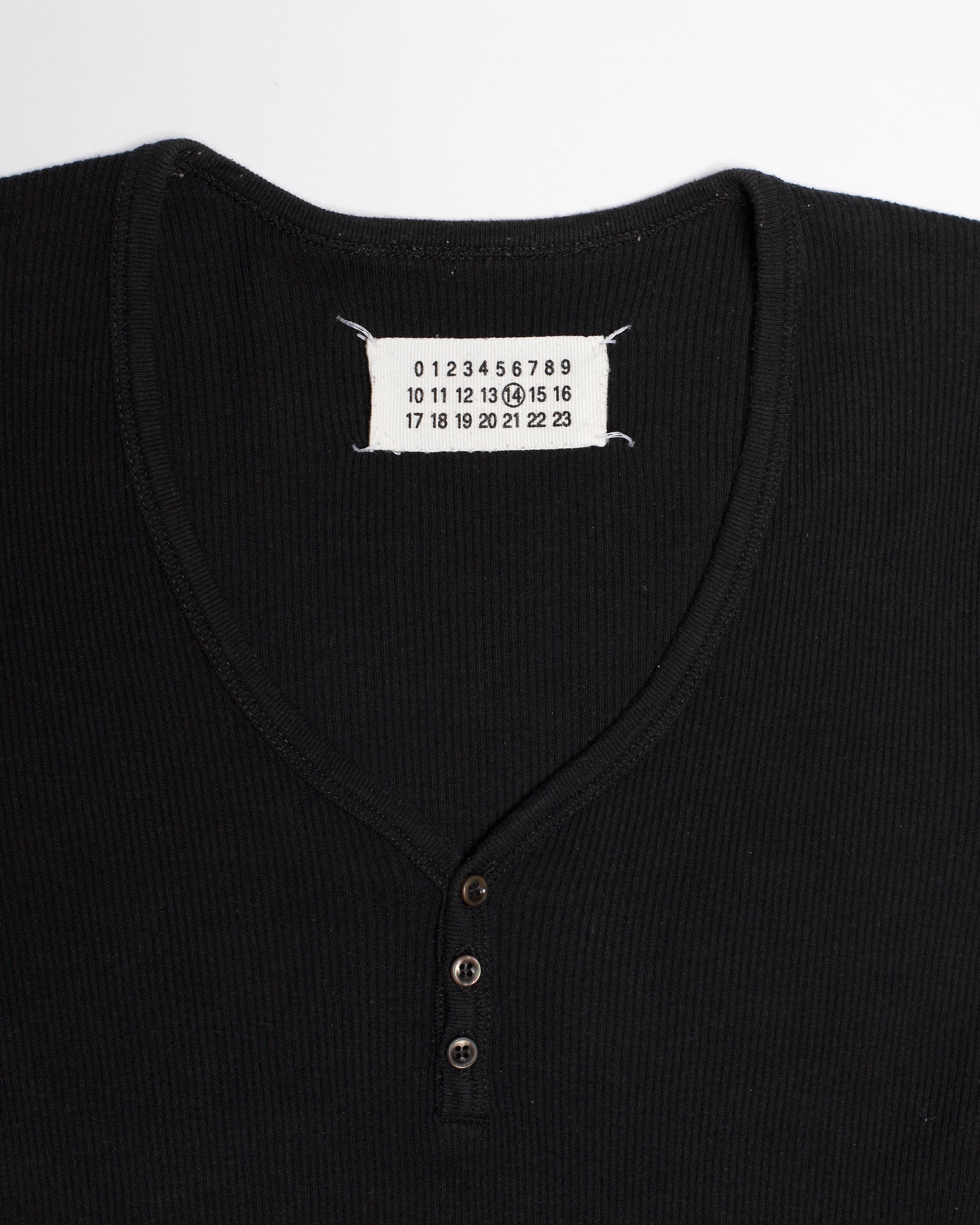 Martin Margiela Line 14 ribbed baby tee in a henley construction. This dates back to when Line 14 was launched and while Martin was still at the house, (c. 2004-2006). Released under Kokonoe, Margiela's Japanese subsidiary.