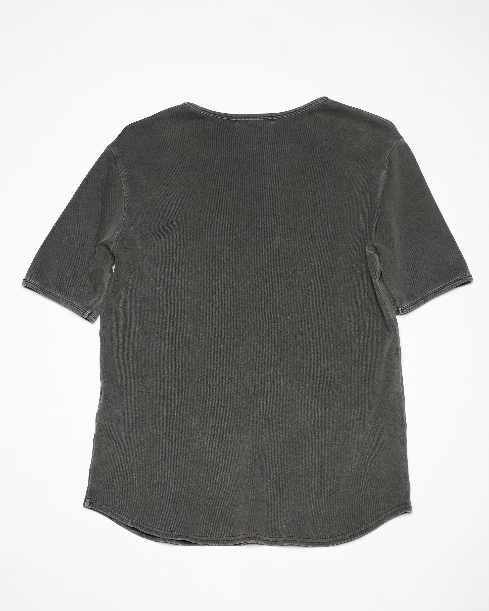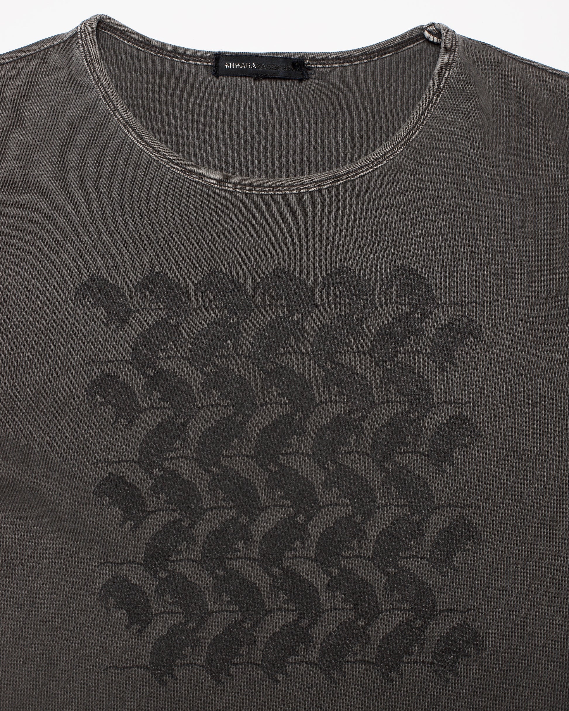 A piece from Mihara Yasuhiro’s earliest 1990s output, this top reflects the designer’s subcultural sensibilities before his international breakthrough. Cut with a slim body with a curved bottom hem and tight sleeves, it emphasizes a sharp, form-fitting silhouette. The chest is emblazoned with a repeated graphic motif of rats, an emblematic choice that channels themes of urban grit, underground culture, and irreverent play central to Yasuhiro’s early work.