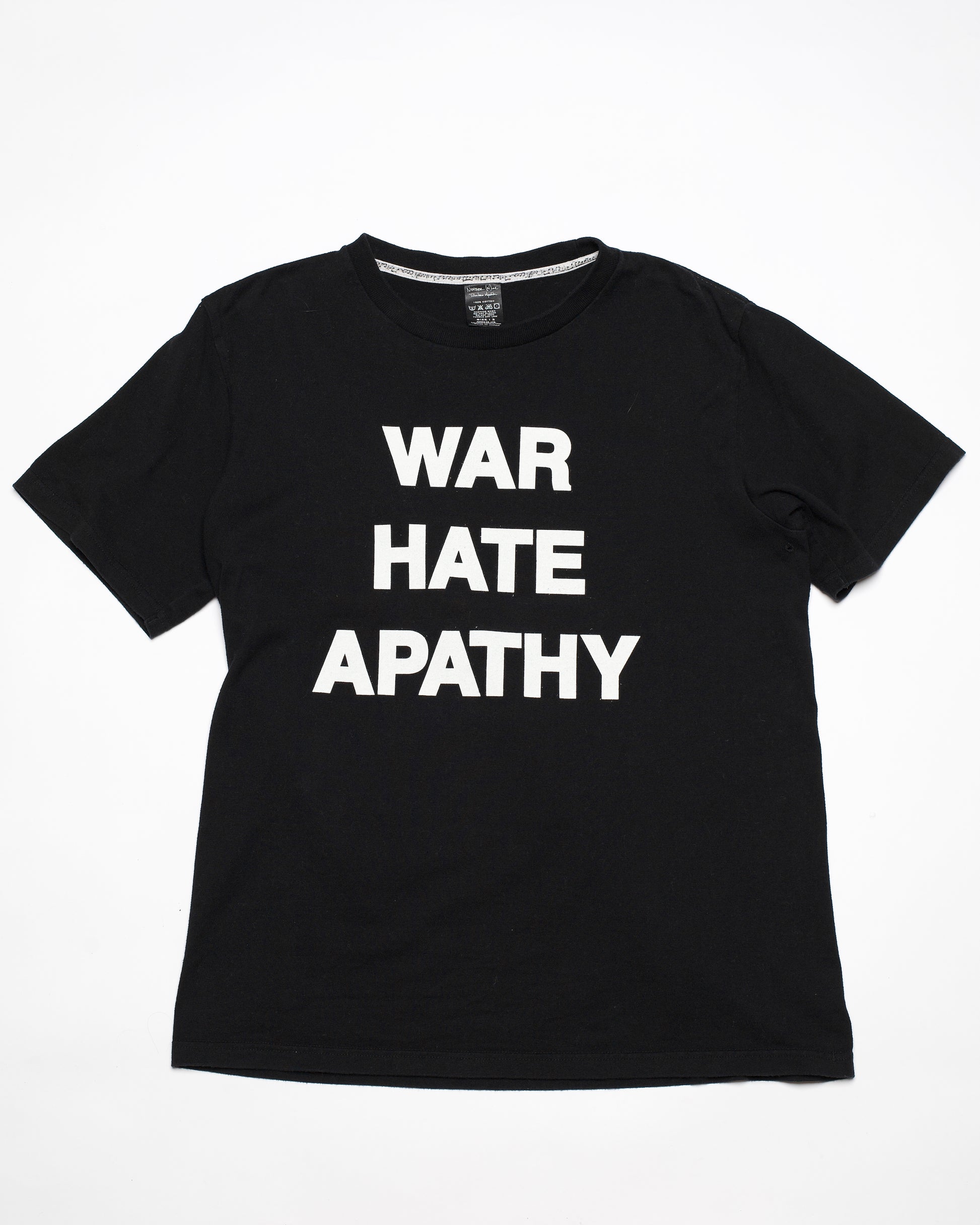 Graphic T-Shirt from Takahiro Miyashita's final collection at Number (N)ine, Autumn-Winter 2009/10. The front graphic boldly features the slogan WAR HATE APATHY, and the rear is a spin off of Sub-Pop record's logo, reading STUPID. The front slogan is a cheeky play on PEACE LOVE HAPPINESS, and the back is spin off Sub-Pop records.