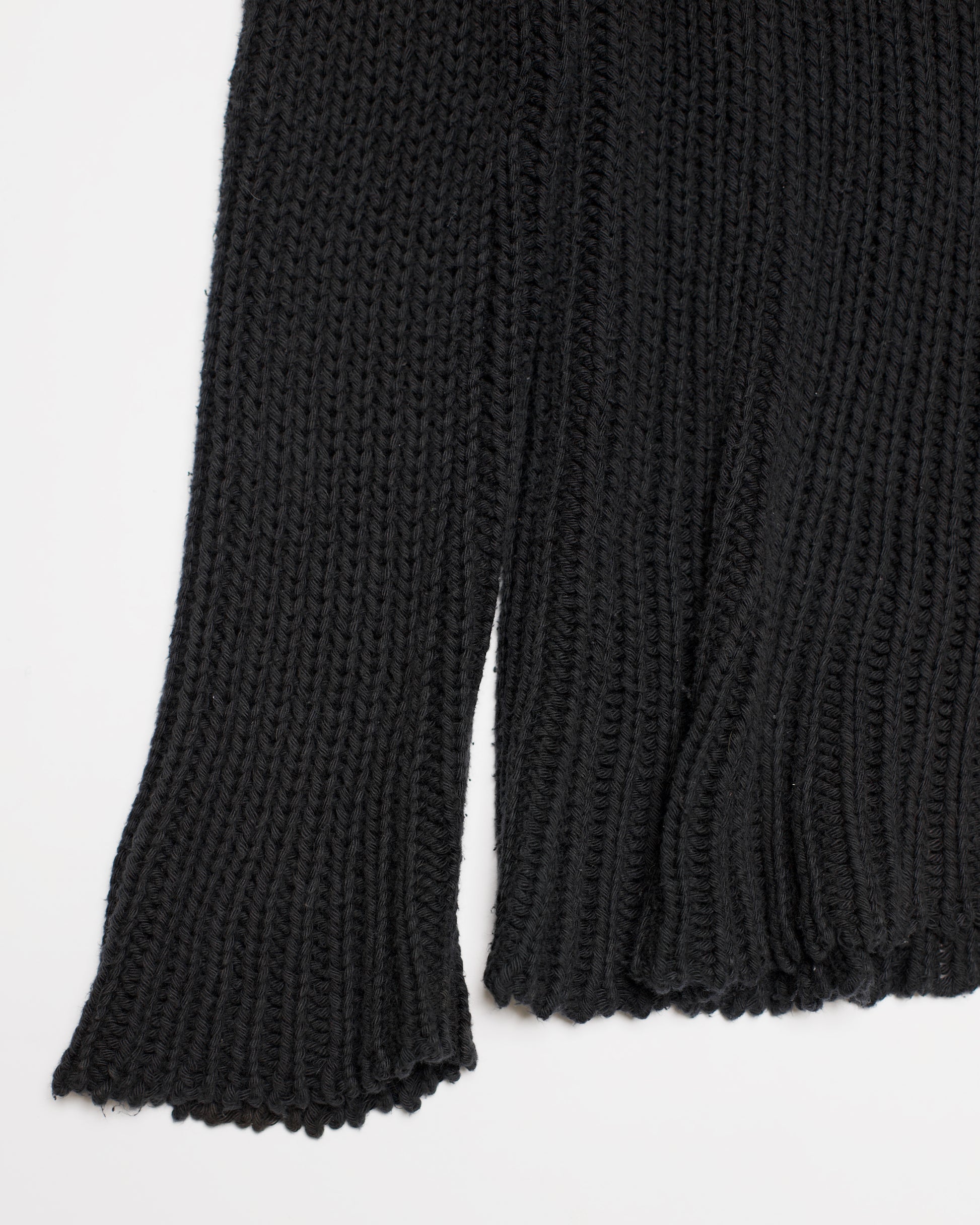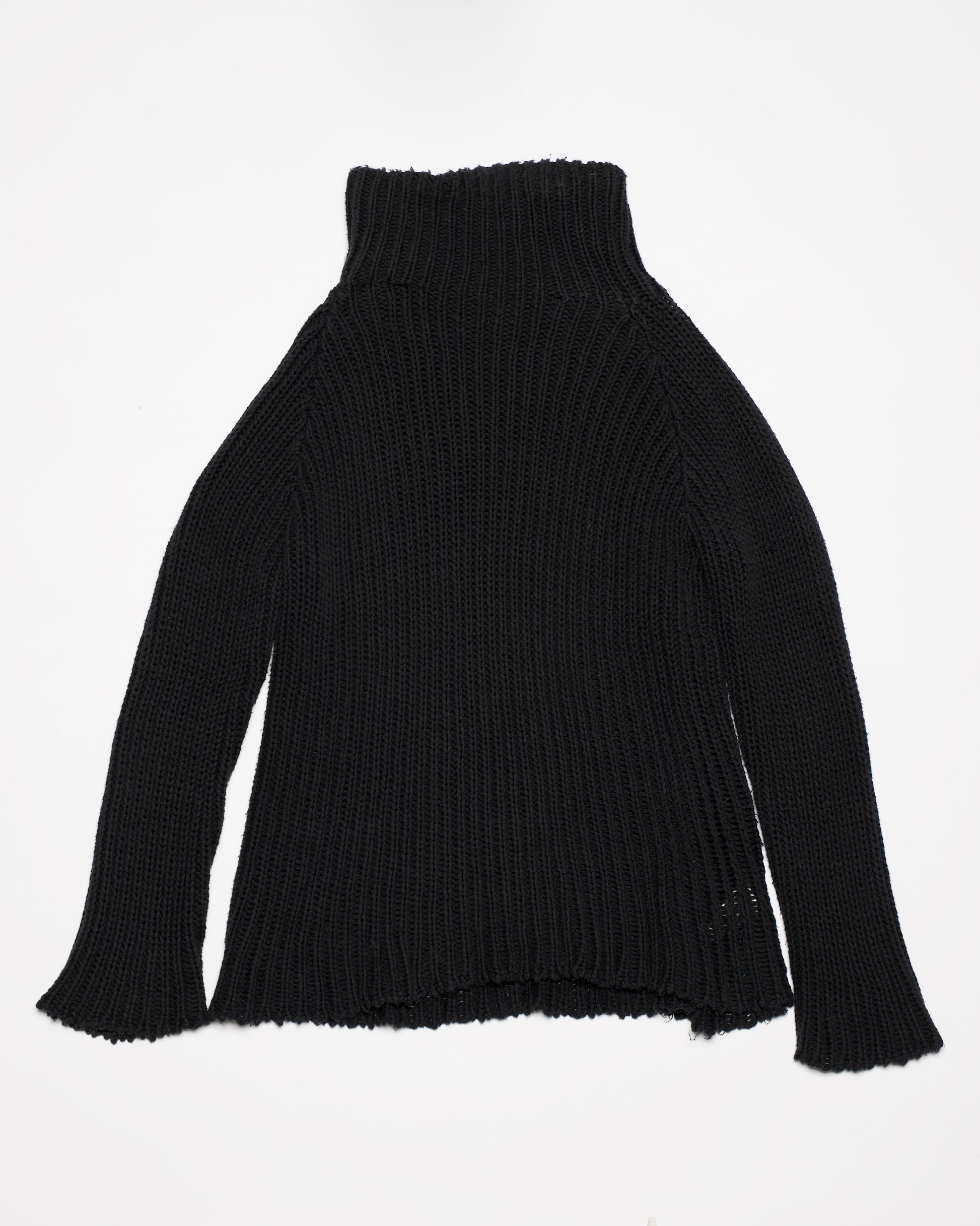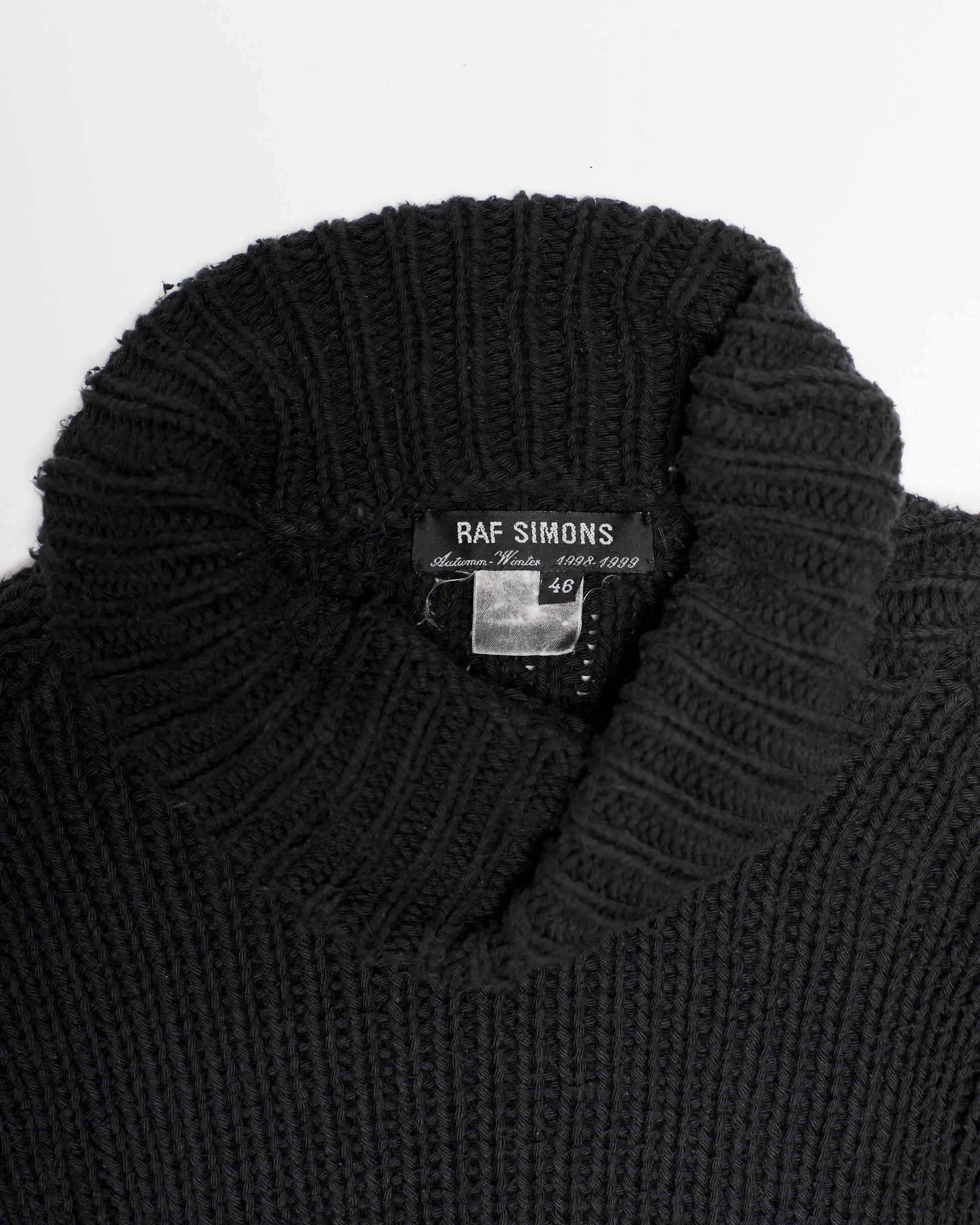 A defining piece from Raf Simons’ landmark Autumn-Winter 1998/99 "Radioactivity" collection. This roll neck sweater encapsulates the designer’s early synthesis of punk, collegiate, and countercultural codes, rendered through a flared body and sleeves and an exaggerated, sculptural neck roll. The proportions feel deliberate and defiant, a quiet subversion of traditional menswear silhouettes that would become central to Simons’ visual language.