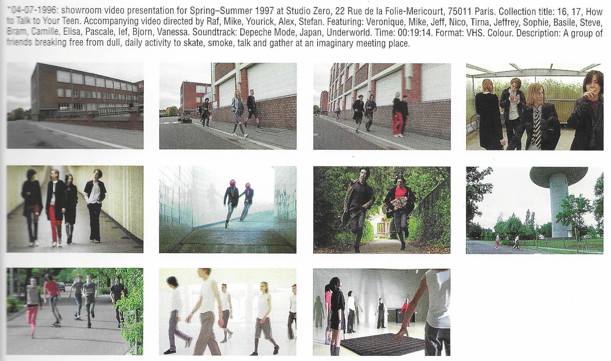 The piece appears in Ronald Stoops’ video piece documenting the SS97 collection, a stylized video presentation that has since become emblematic of Raf Simons’ early vision. The video captures the collection in a stark, choreographed format that underscores Simons’ fascination with teenage identity, youth rebellion, post-punk austerity, and subcultural codes.