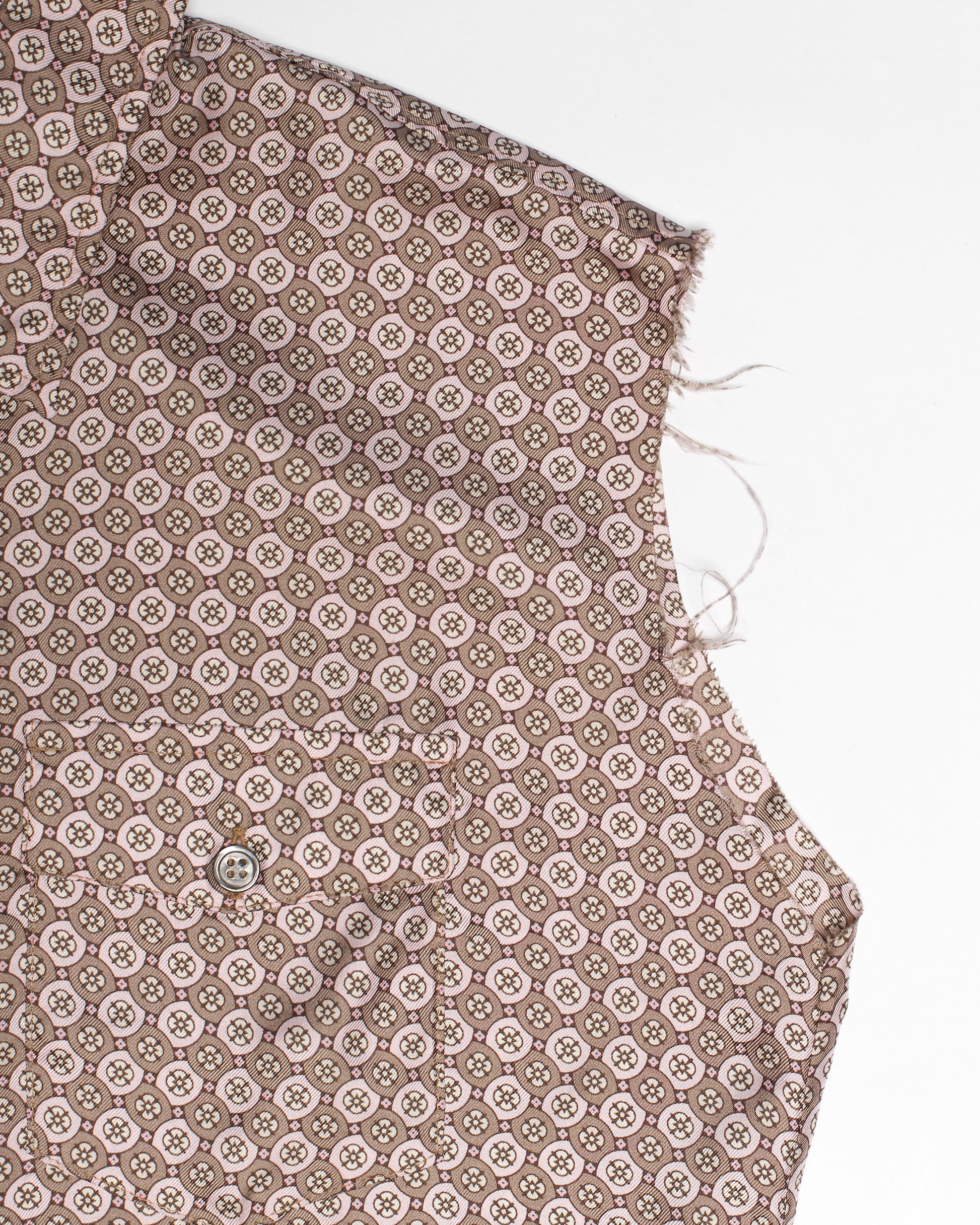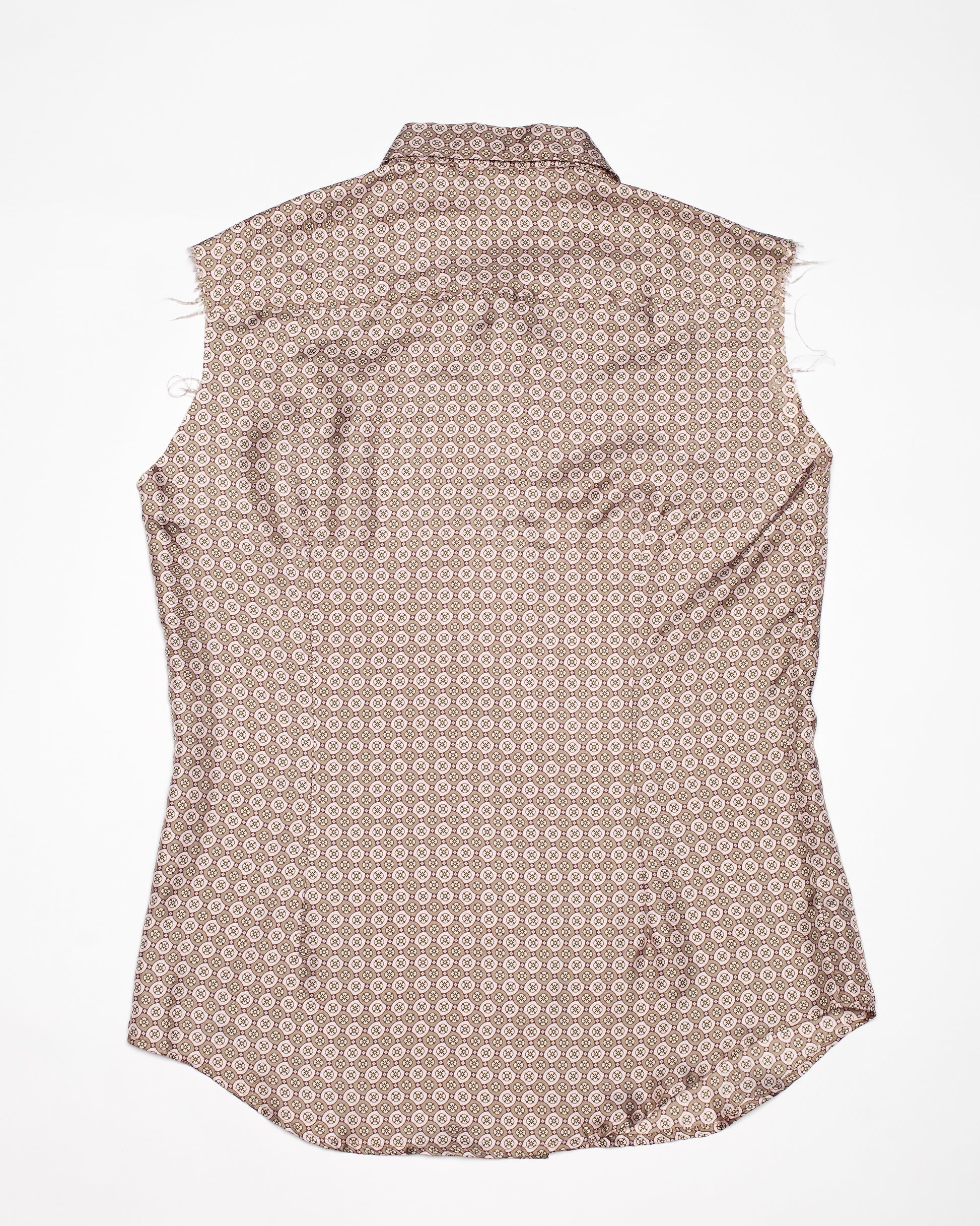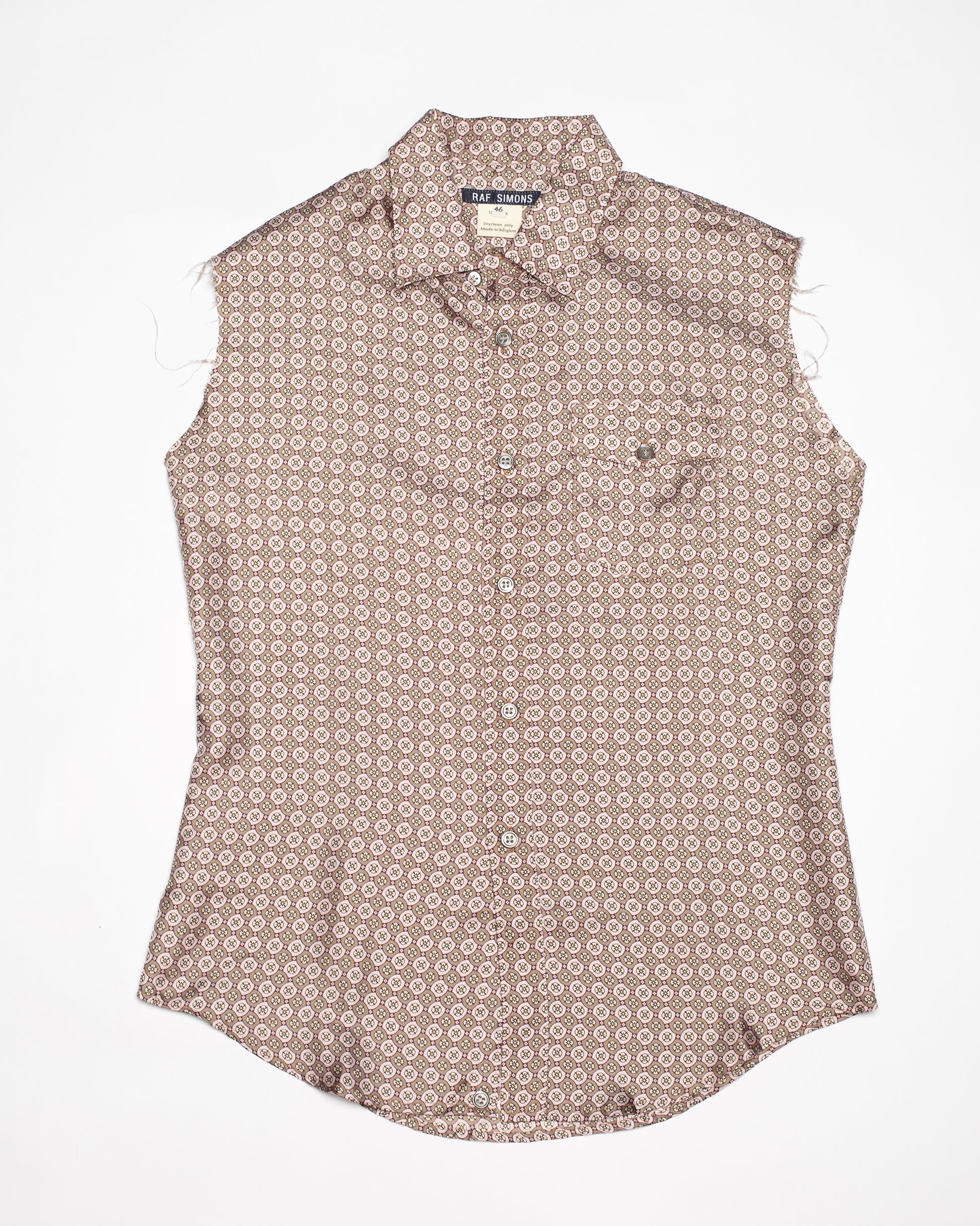Rare sleeveless silk button-down from Raf Simons’ Spring/Summer 1997 collection, Teenage Summercamp — a pivotal early body of work that helped define his singular approach to youth, uniform, and rebellion. Crafted from soft, luxurious silk, the top features raw-cut armholes and subtle darting at the lower back on each side, creating a fitted, sleek-lined silhouette that’s both minimal and sharply tailored.
