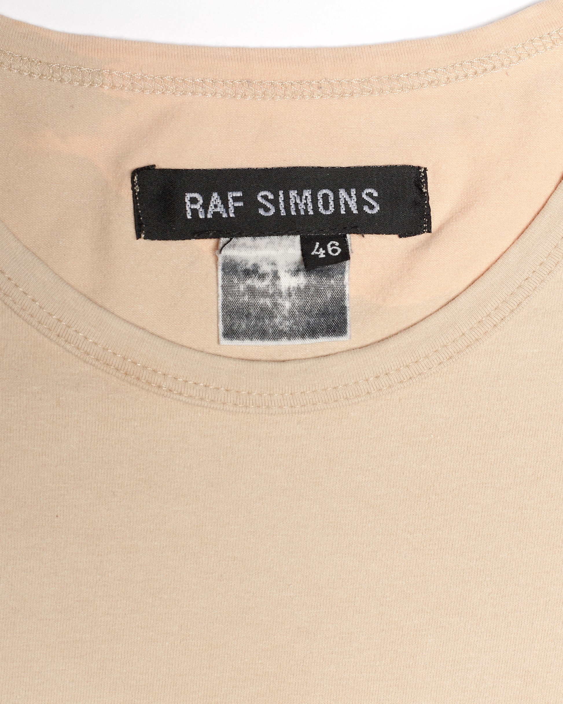 From the iconic Kinetic Youth collection, this light beige, salmon-hued top exemplifies Raf Simons’ late-90s fusion of post-youth rebellion and precise tailoring. Cut in a cropped, slim silhouette with distinctive 7/8-length sleeves, it features clean minimal construction and a soft, slightly structured fabric and curved hem at the bottom in true Raf style. Subtle yet charged with the collection’s subcultural energy, this piece is a rare archival garment from a pivotal moment in Simons’ early career.
