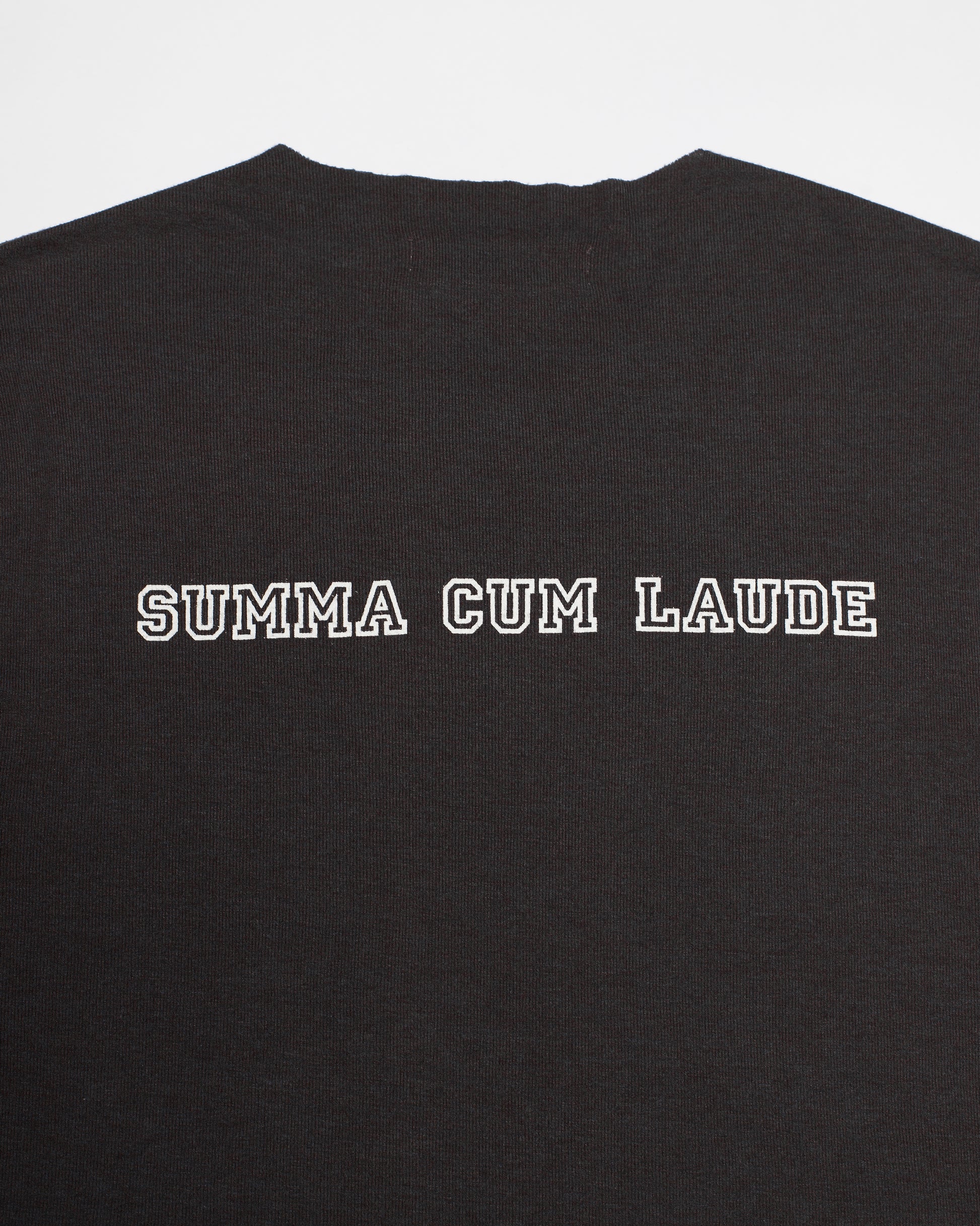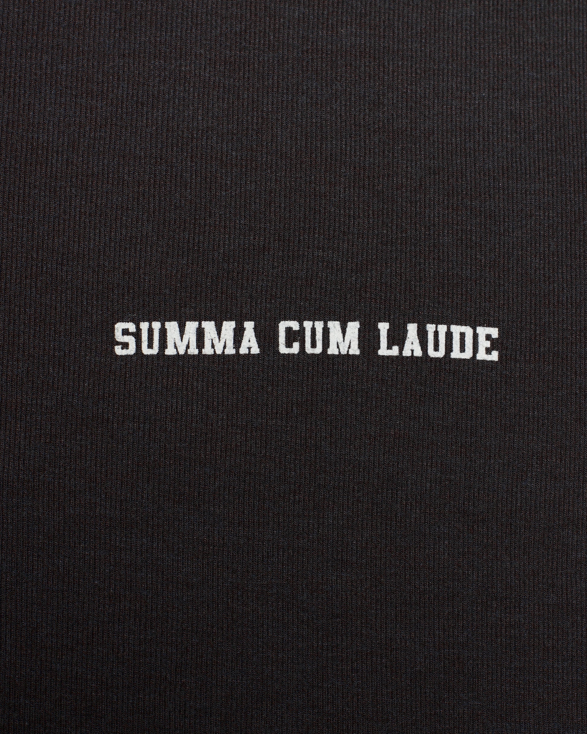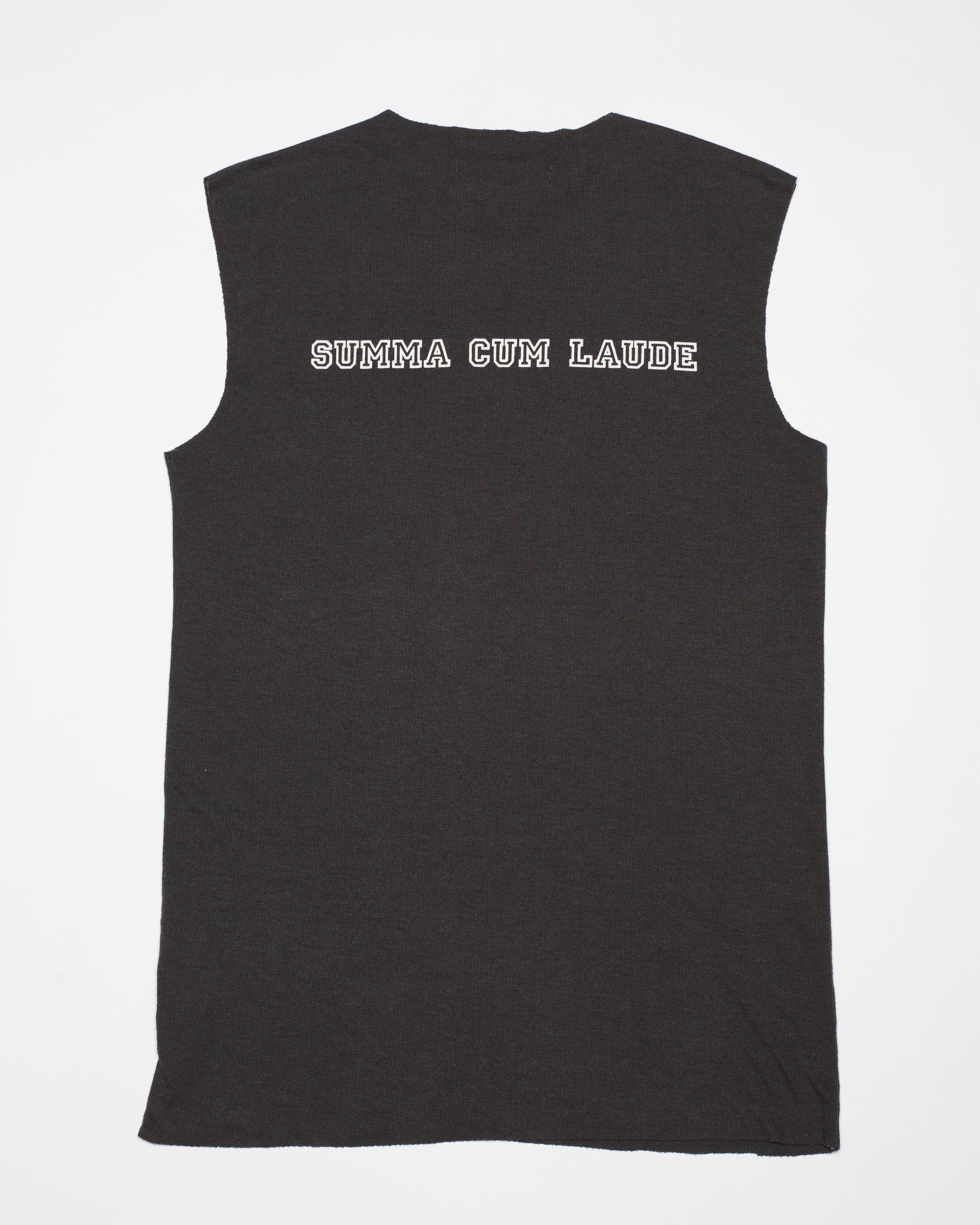 Black cut off tank top from Raf Simons' vaunted Spring-Summer 2000 collection. A rare, hard to find collectable graphic top featuring the 'SUMMA CUM LAUDE' phrase printed on both the front and back, the garment is a perfect representation of Simons' early uniform-inspired work.