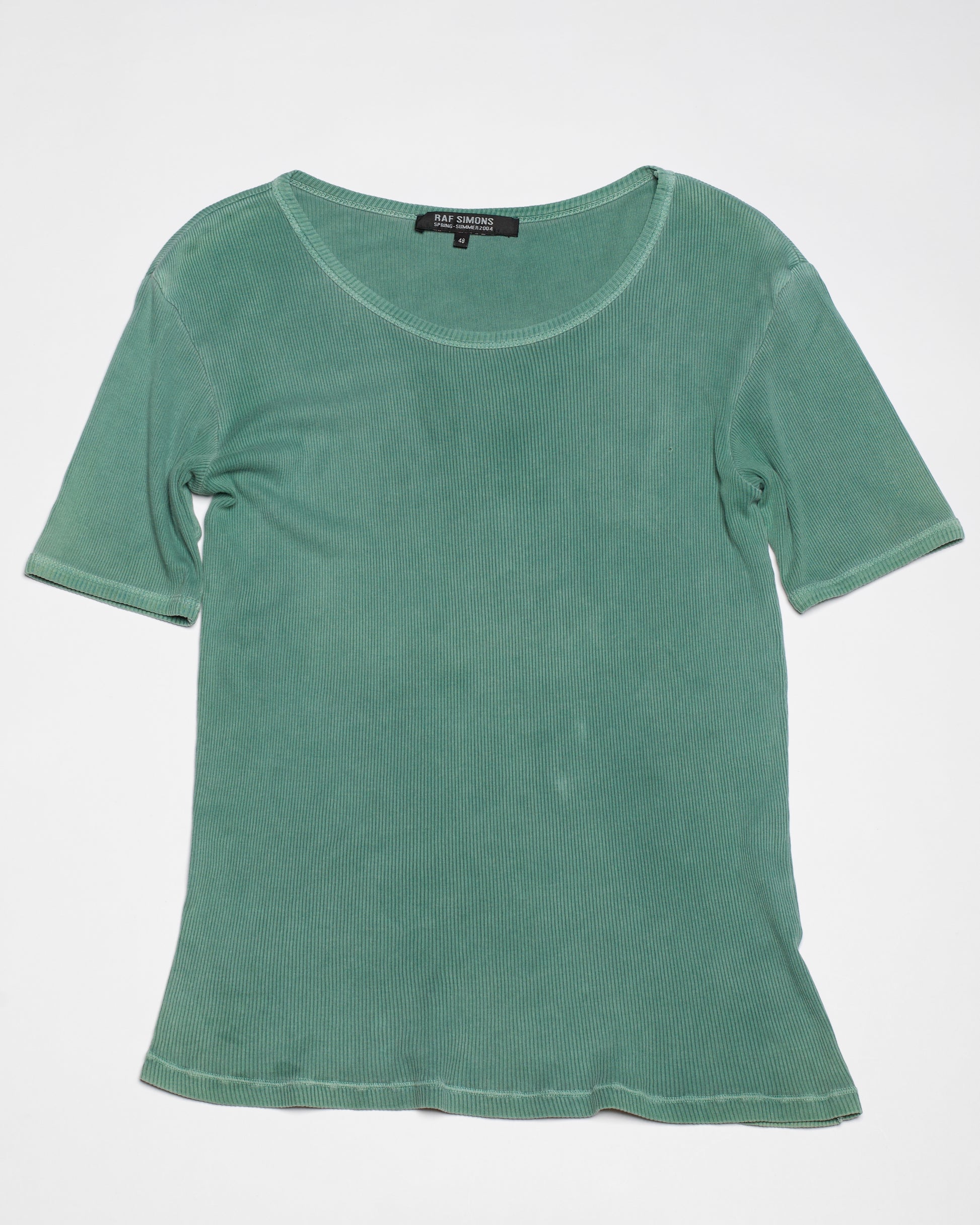 Raf Simons teal ribbed short sleeve top from his vaunted Spring-Summer 2004, collection, 'May the Circle Be Unbroken'. Based off the 1922 novel by Hermann Hesse, 'Siddhartha', the collection was a rigorous explanation of spirituality the symbolism of Hindu, Gnostic, Buddhist, and Ascetic religions.