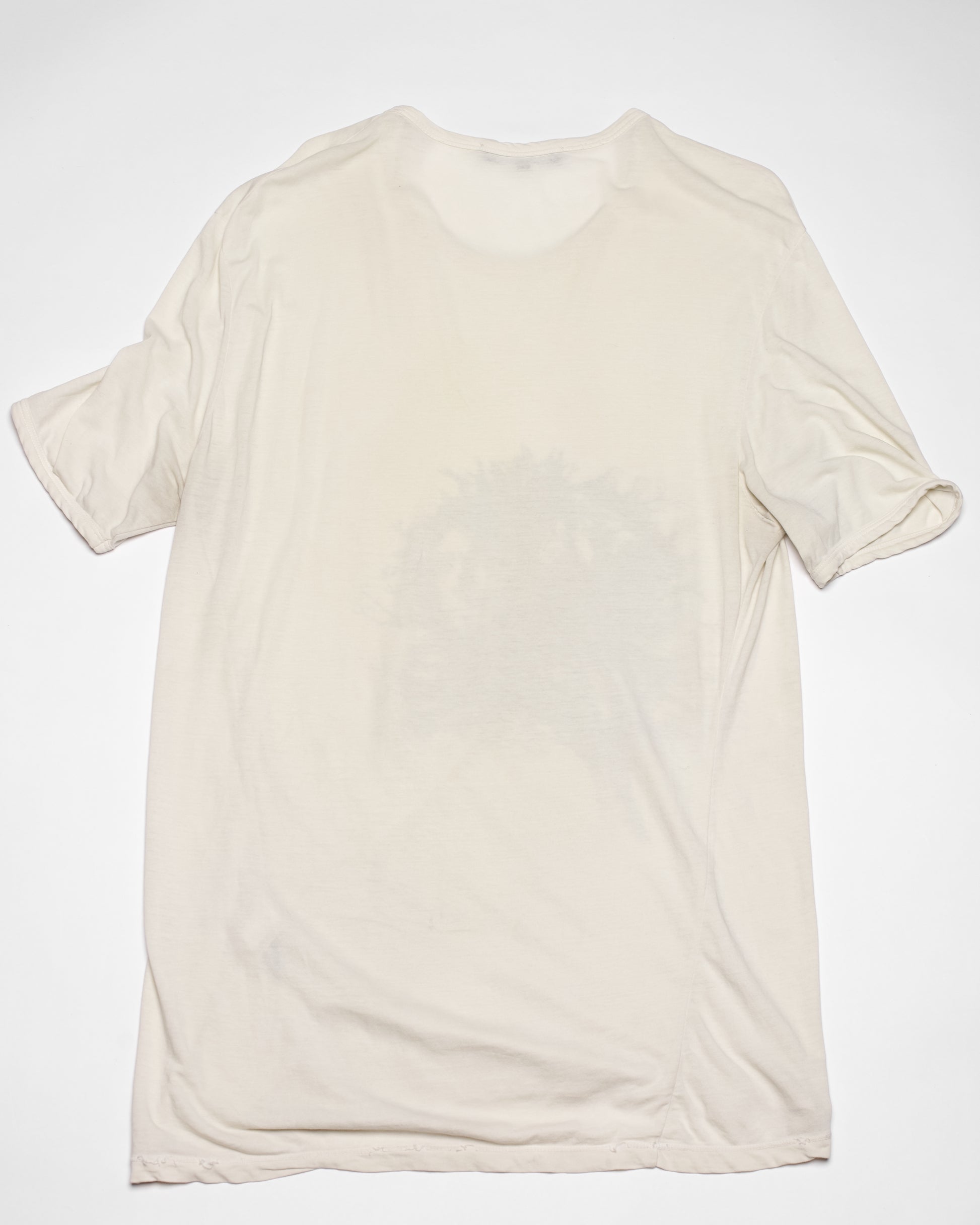 Tagged a size 52, so this a rare L/XL version of this tee. 92% cotton, 8% spandex. Good condition for its age, with minor pinholing on the front side, and some seams coming undone on the bottom hem.