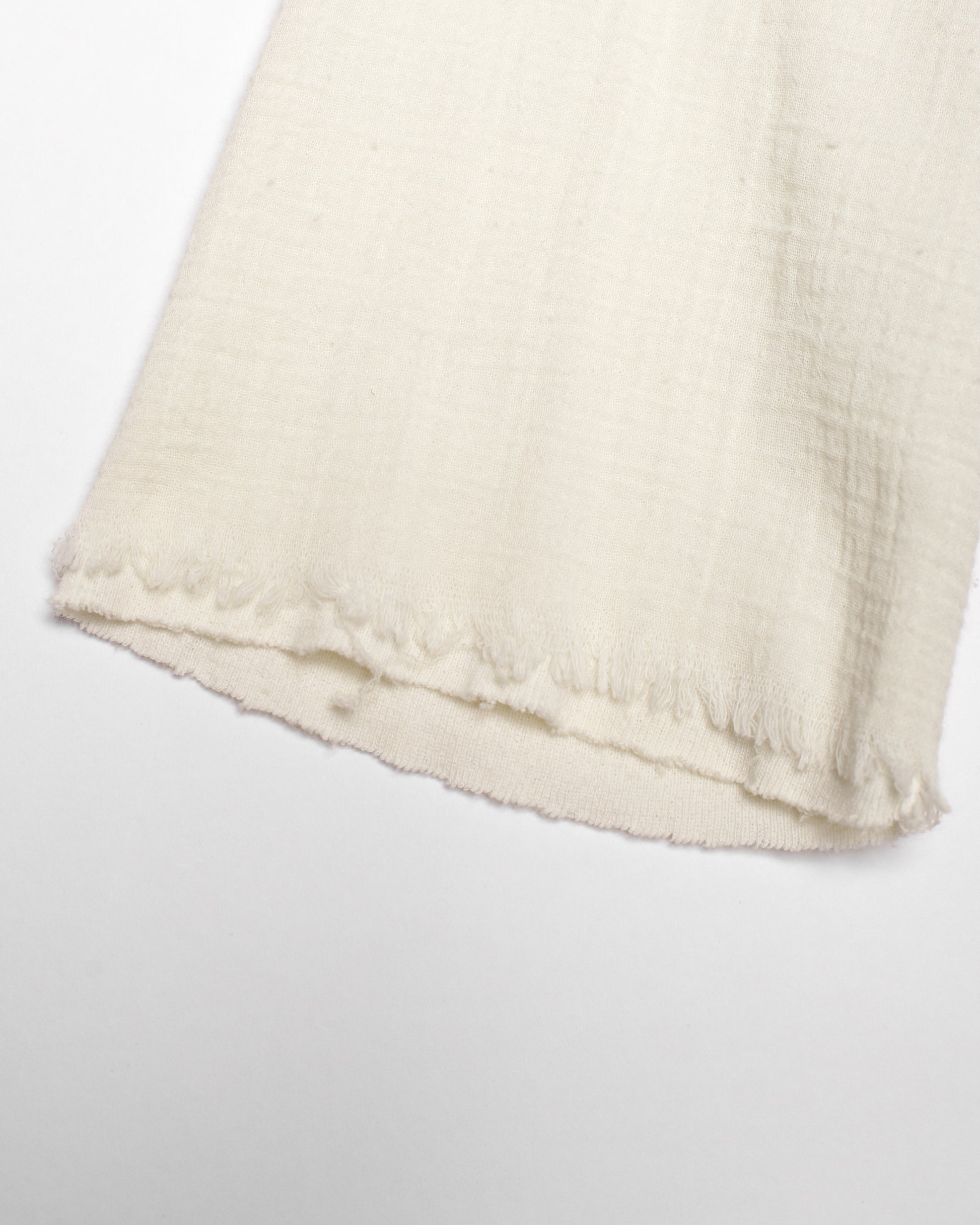 Constructed with a double-layered design, the outer shell is crisp cotton, while the interior sleeves are a soft, lightweight crepe-like fabric that adds structure and depth without weight. The cut is cropped and boxy, and tee creamy, vanilla-toned off-white fits seamlessly within the palette of the collection: muted, contemplative, and ethereal.