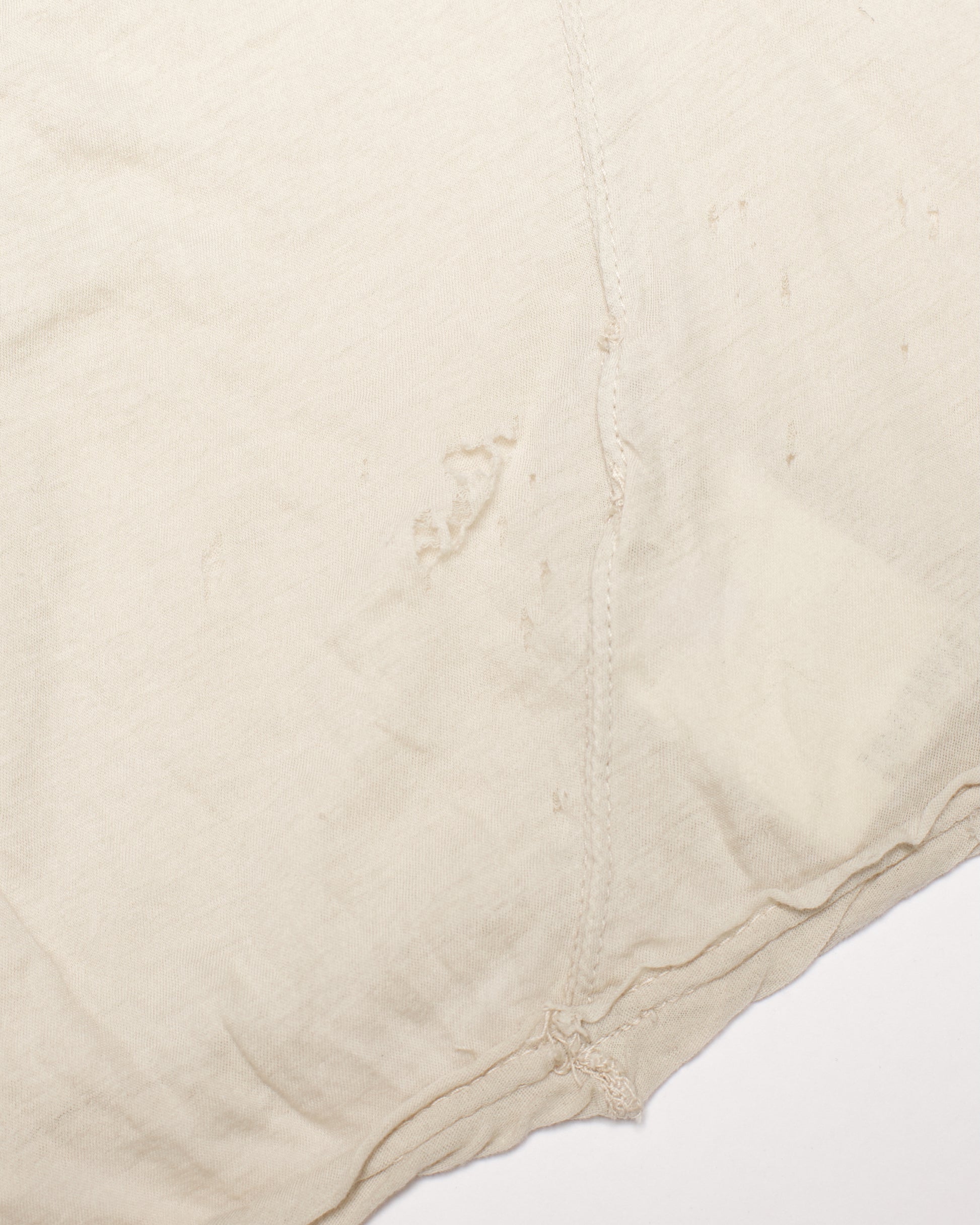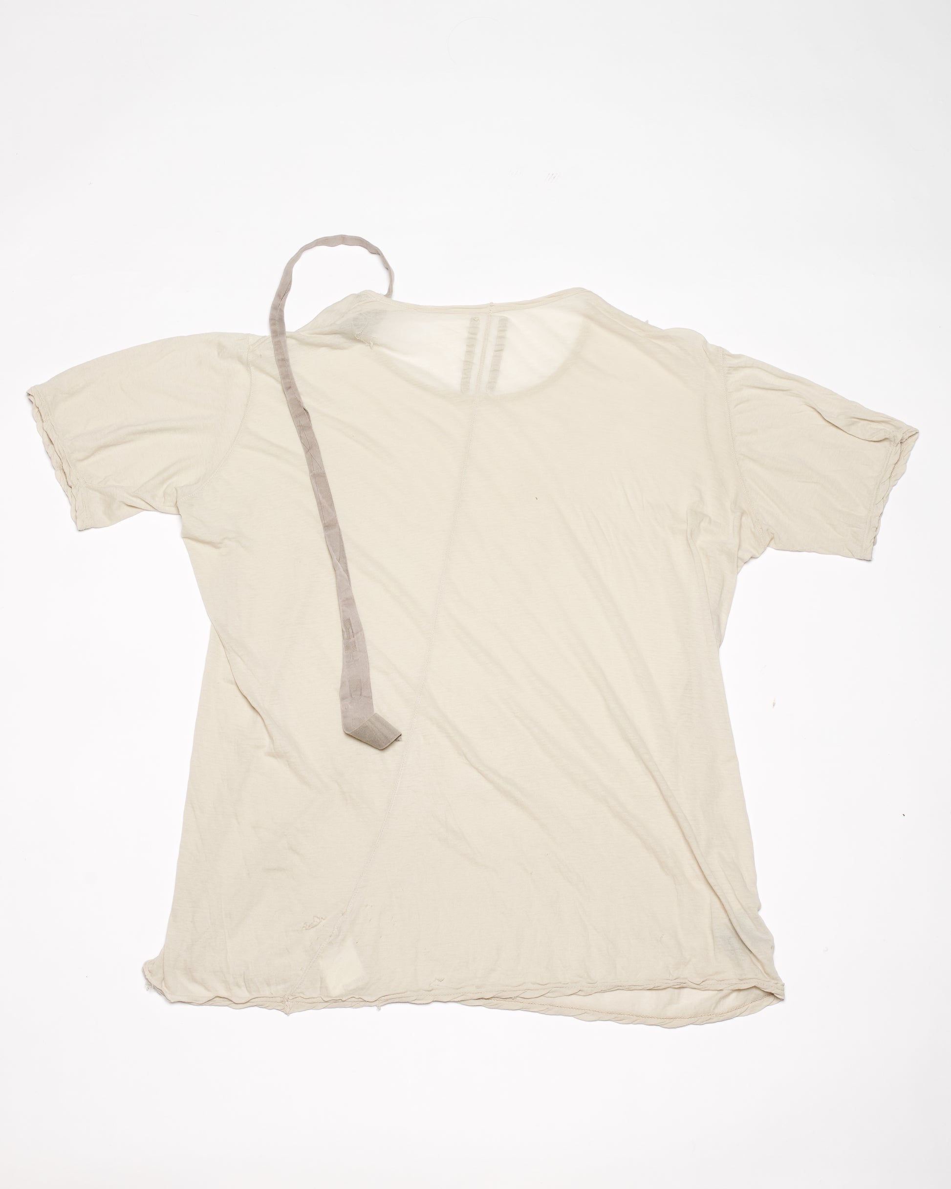 A Rick Owens DRKSHDW top in his classic 'Pearl' color way. Crafted in a paper-thin, sheer cotton, it features distressing throughout, as the fabric has started to shred away in parts. Includes DRKSHDW sewn logo and brown extended tag from shoulder.