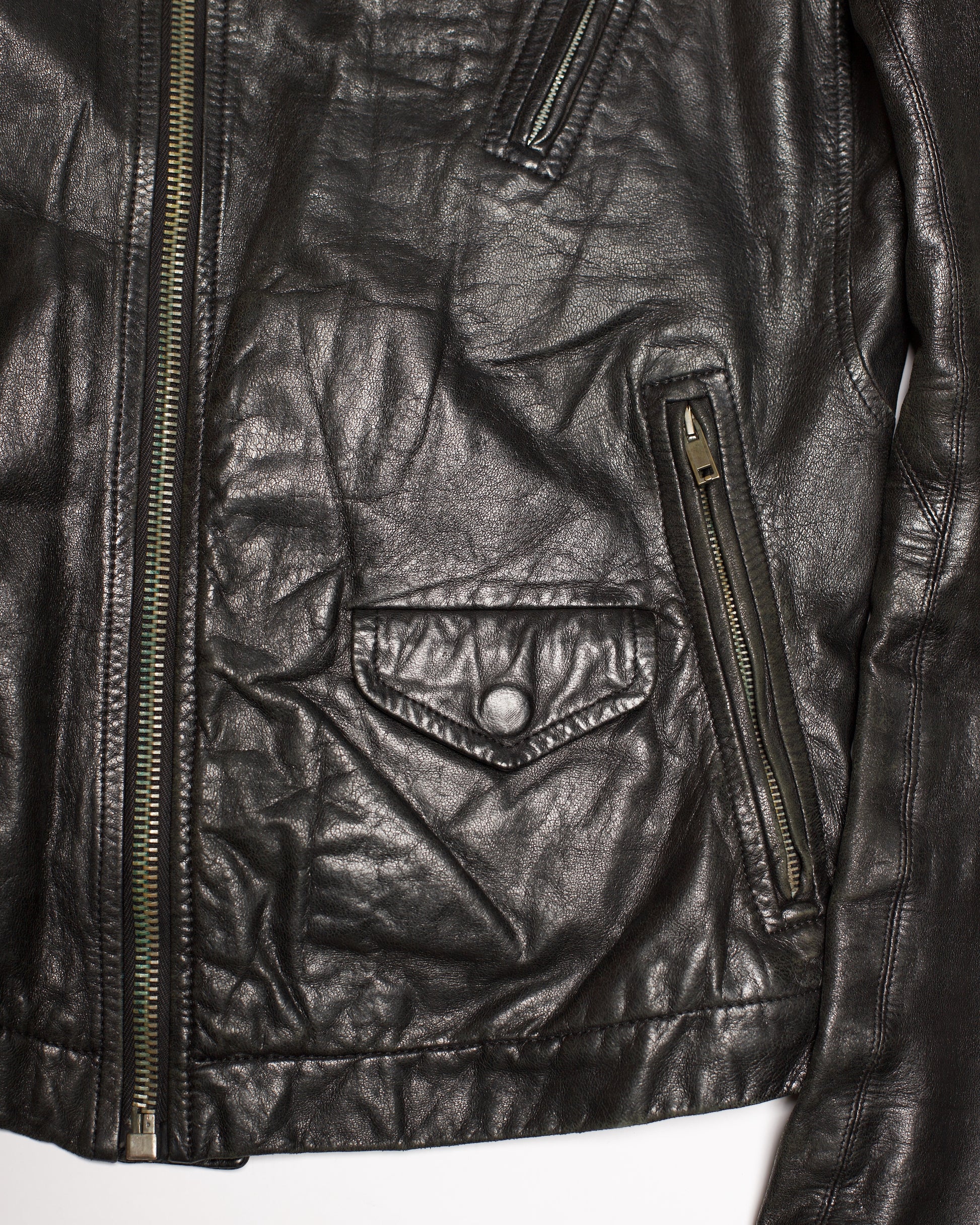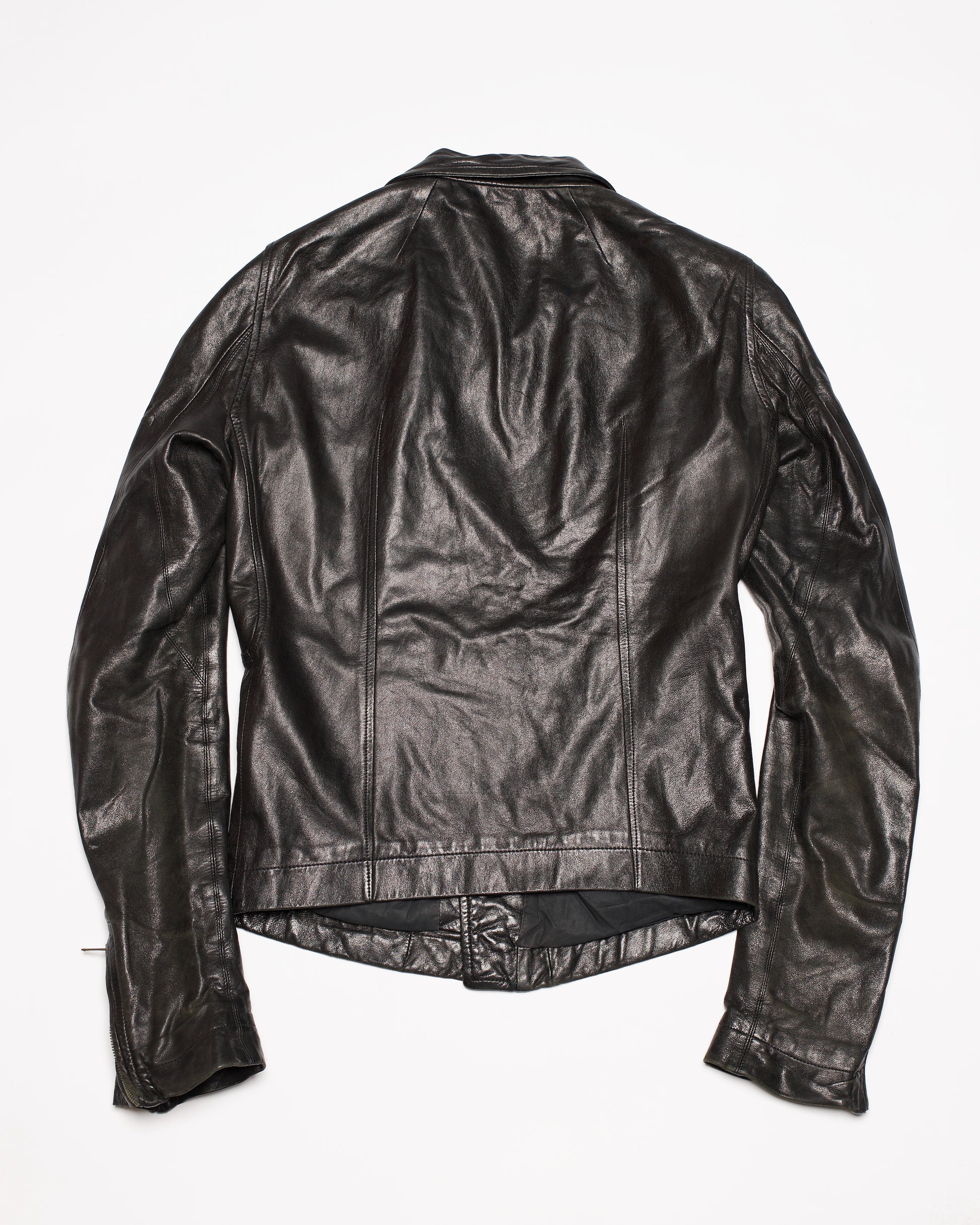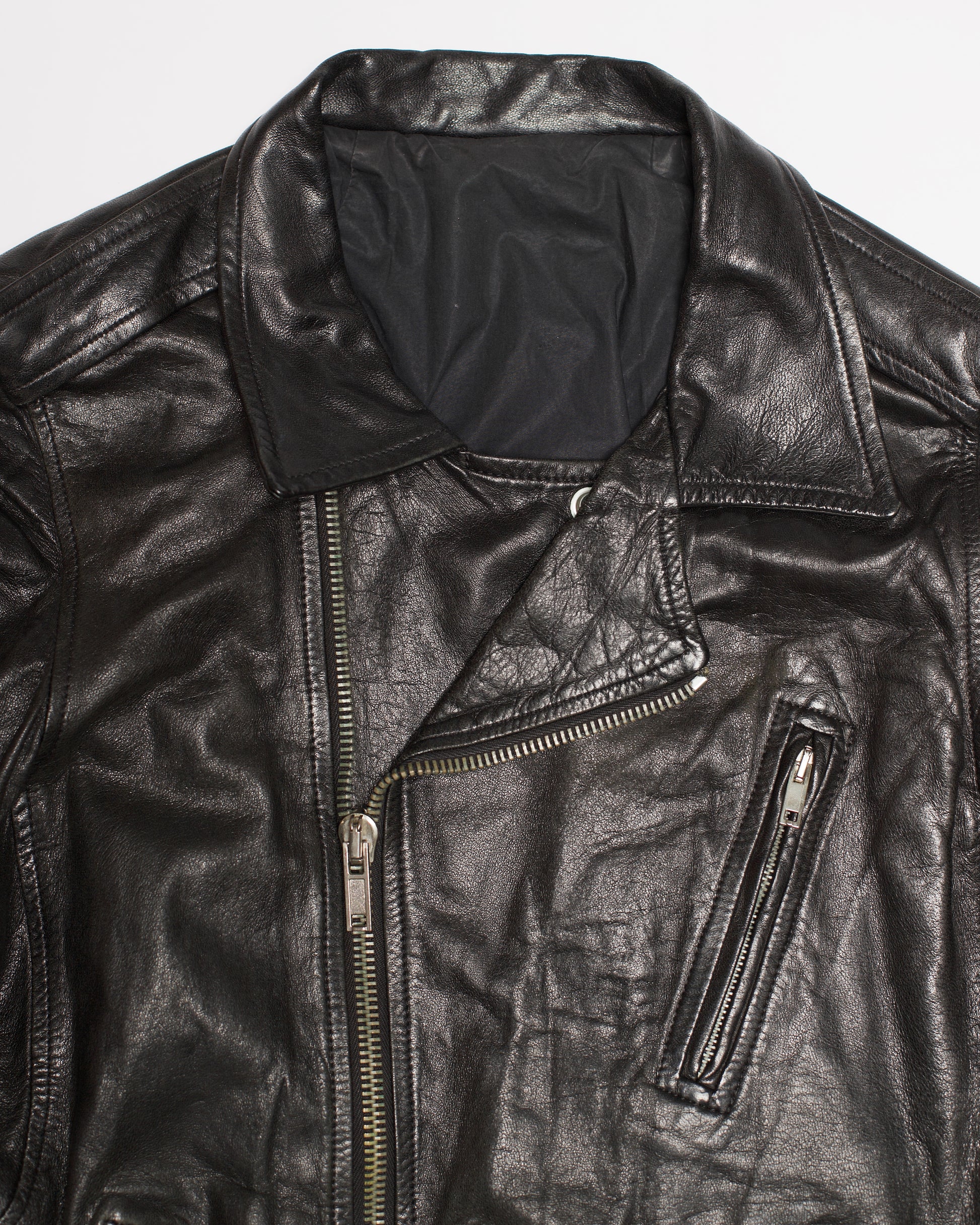 Rick Owens mainline lamb leather jacket, produced by Olmar & Mirta in the late 2000s. Sewn at their Moldova factory, this jacket represents the pinnacle of the Italian manufacturer’s leather craftsmanship, as their highest-quality leather pieces were produced at this location until the early 2010s.