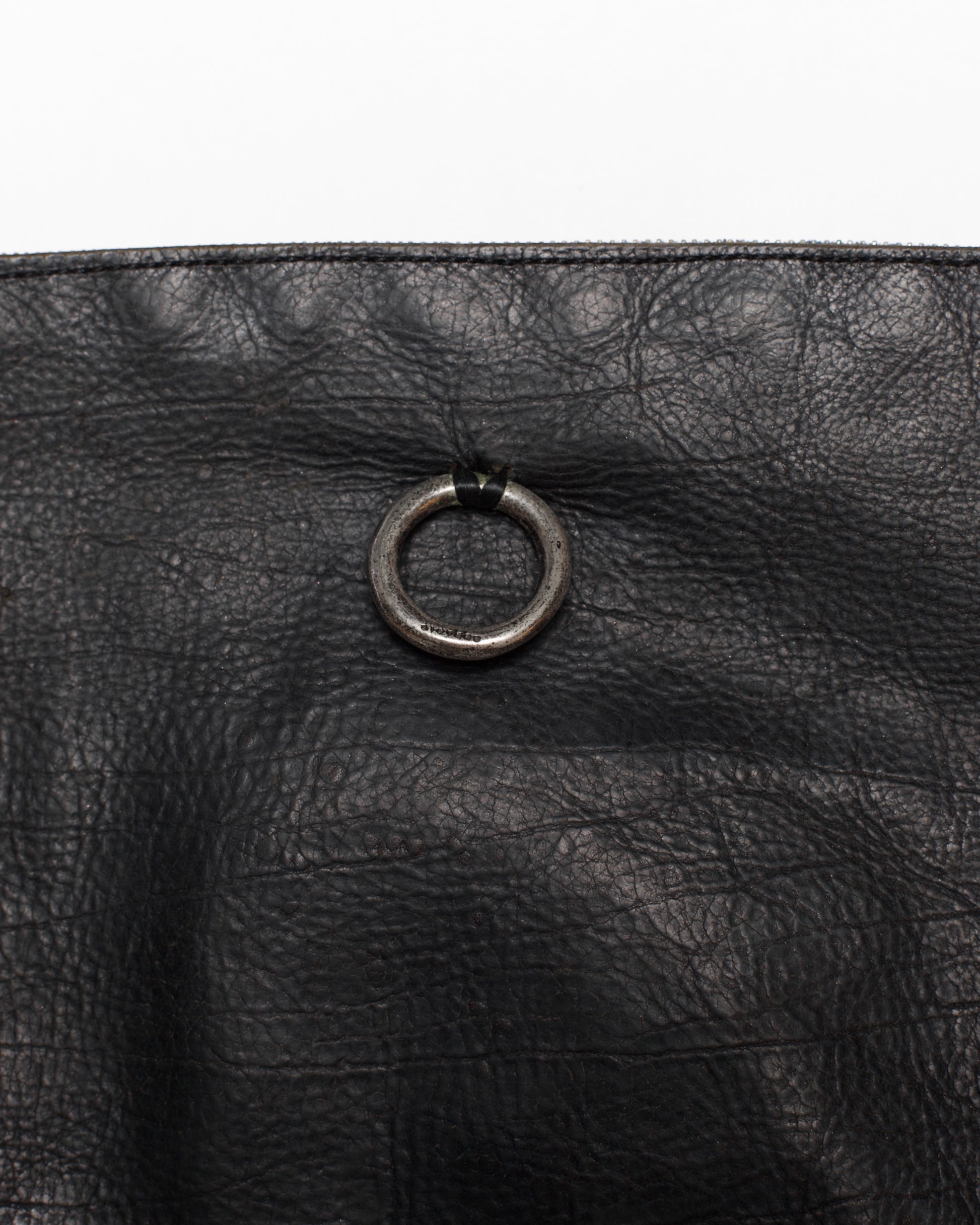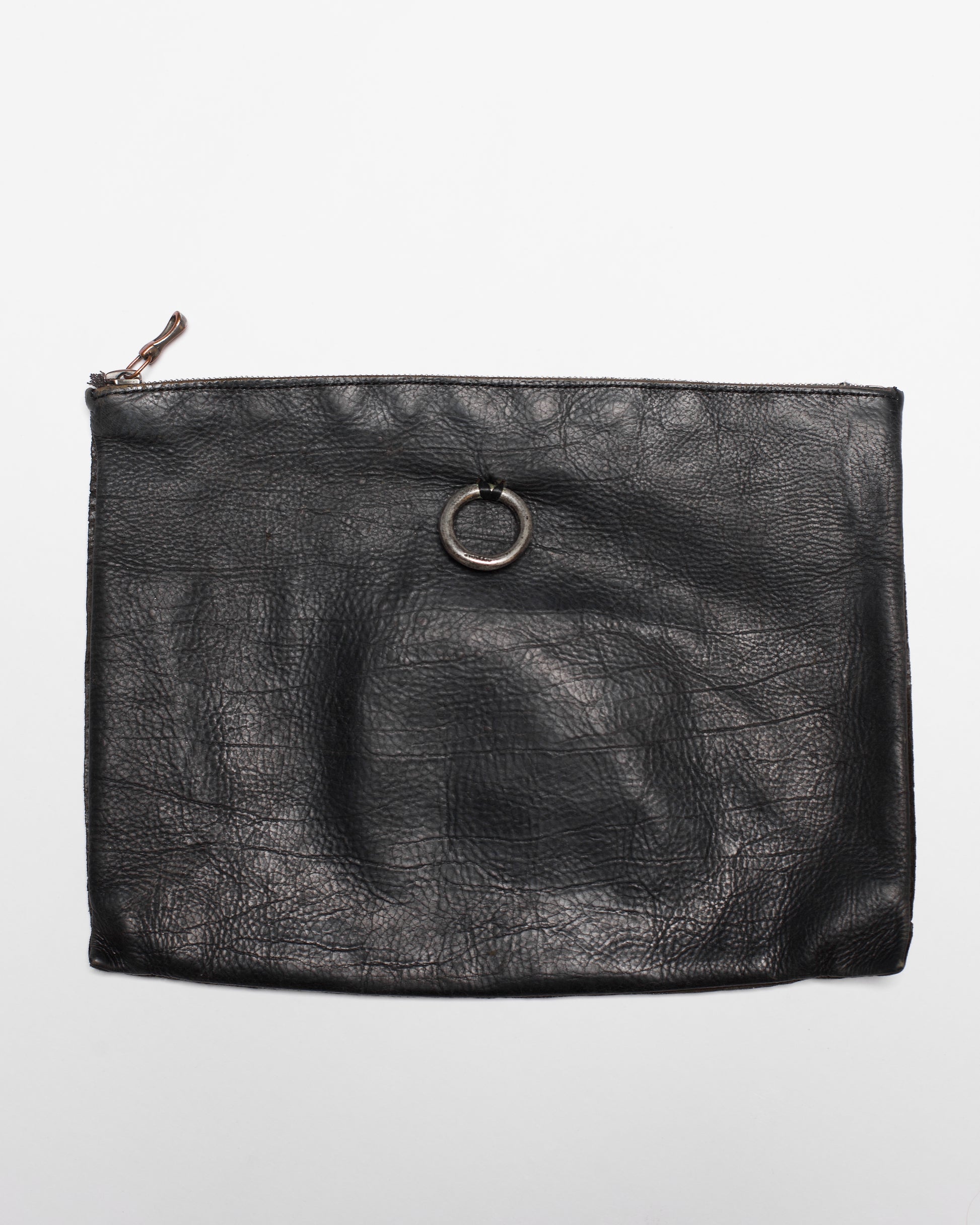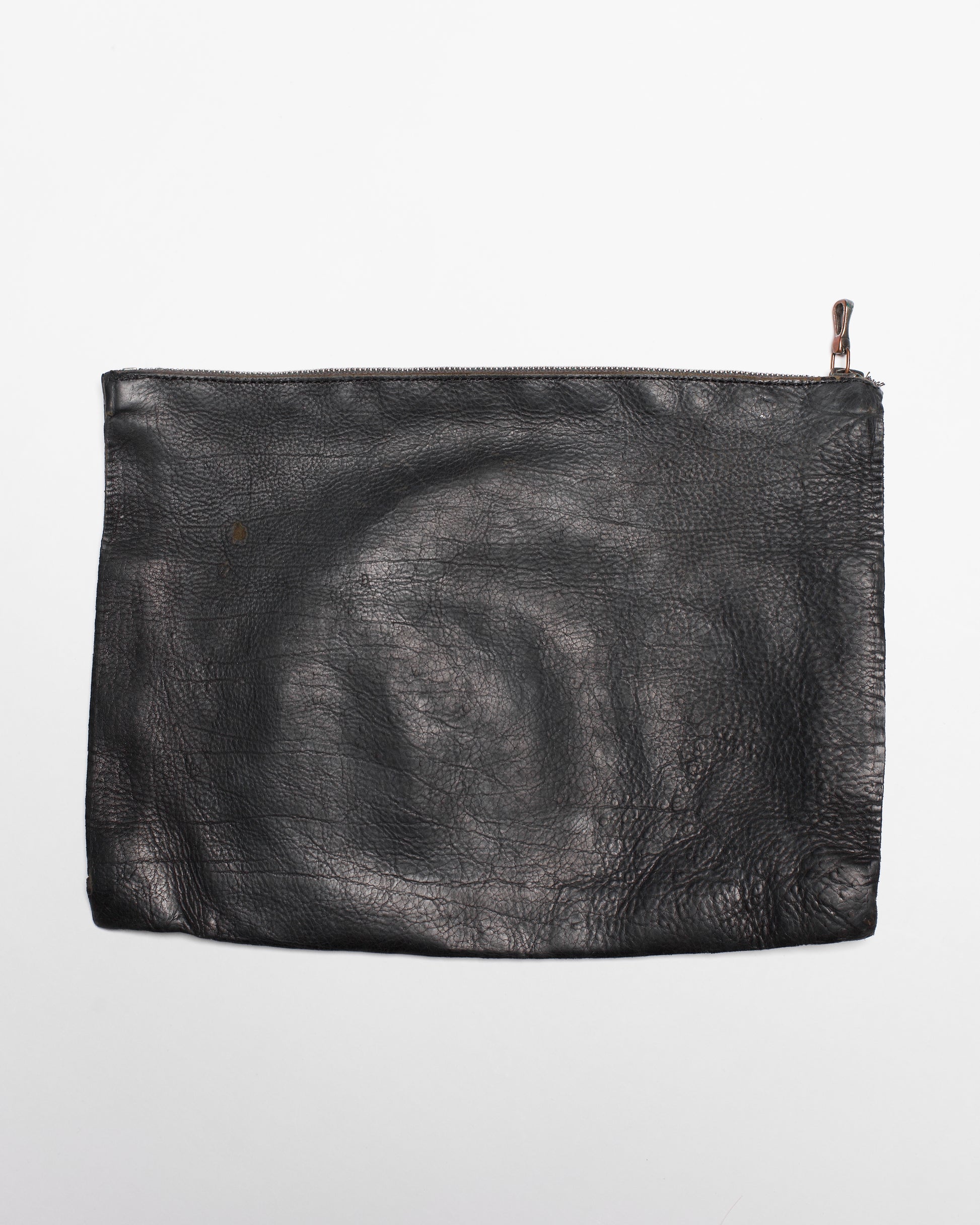 Artisanal black leather wallet pouch from Japanese label S/Stere, known for its quiet, brutal minimalism and high-quality materials. Constructed from a supple, worn-in calf leather, it features a soft rectangular body with a zip closure.