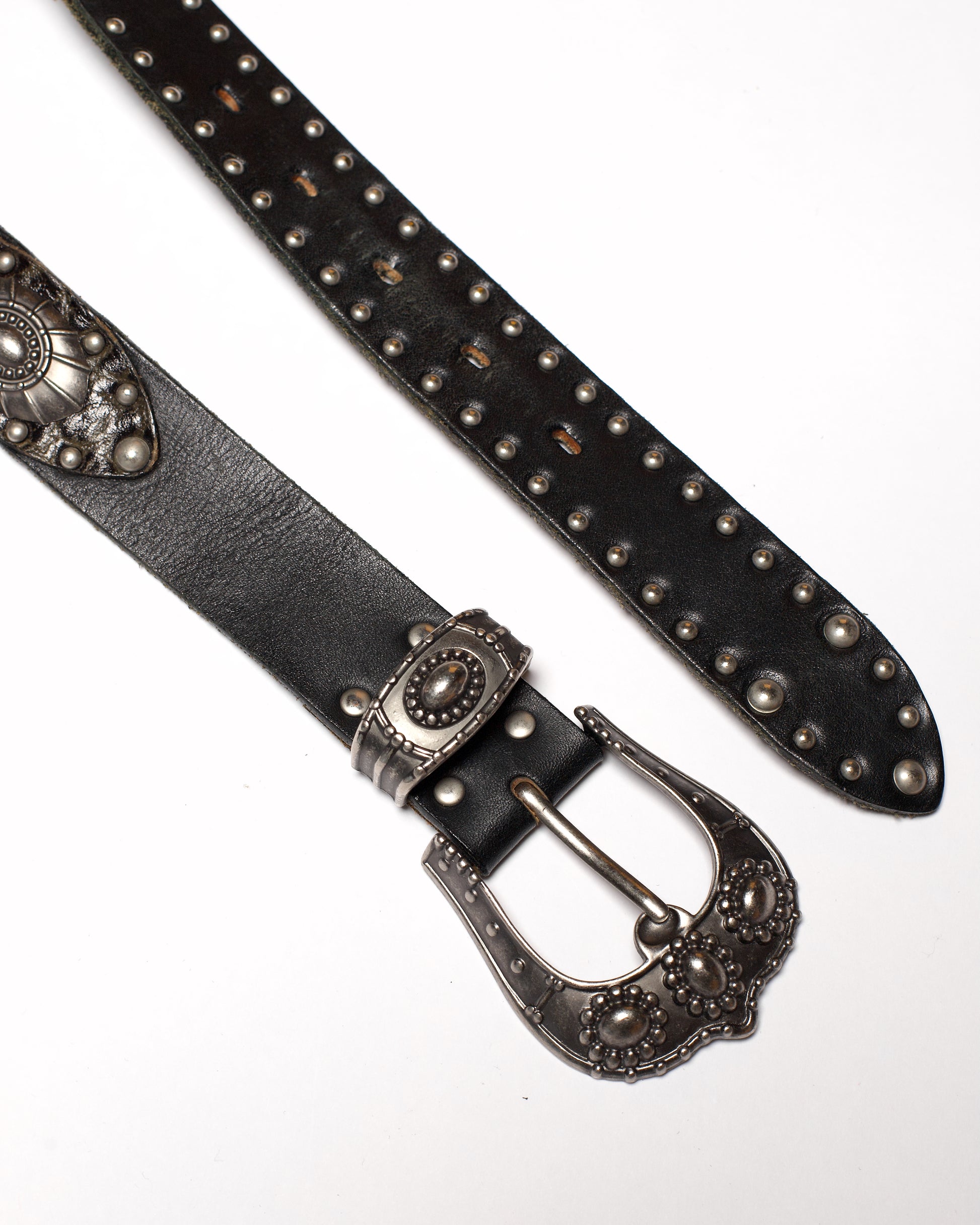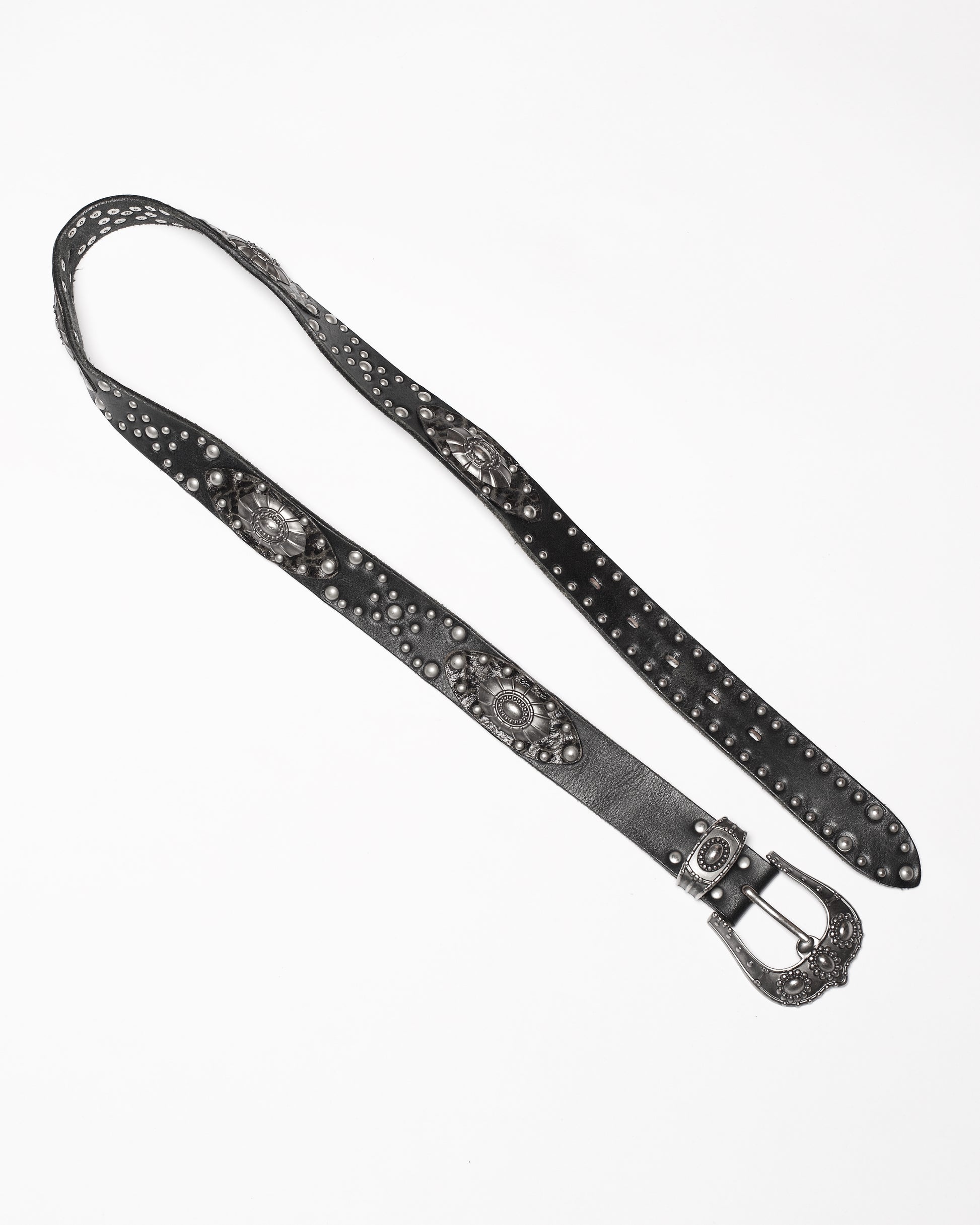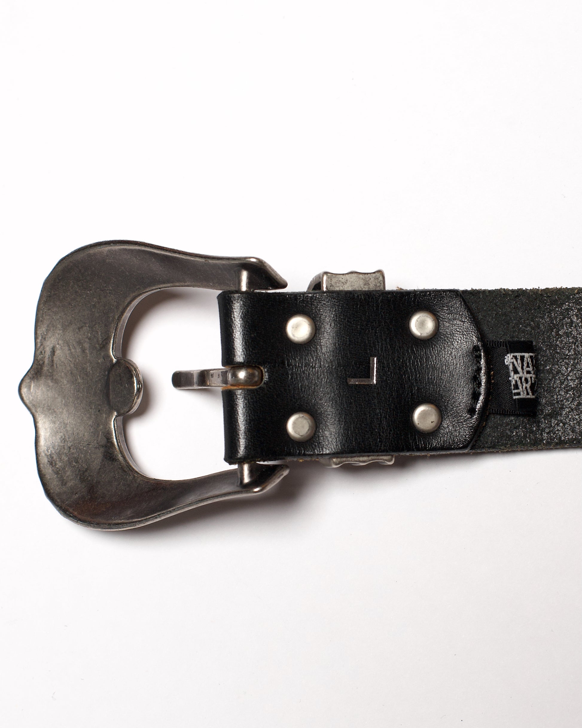 Black leather belt from Japanese label Tornado Mart, featuring metal embossing and hardware throughout.