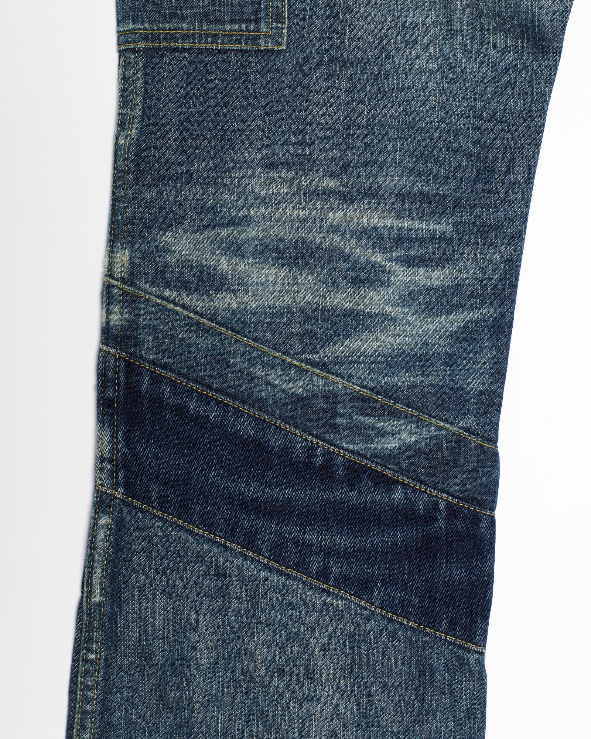 Denim pants from Undercover's Autumn-Winter 2001/02 collection, 'D.A.V.F.'. Takahashi's collection centered around the theme of 'anti-war', and focused on visually striking, maximalist garments. The denim features panelled layers of shaded denim, creating a geometric patchwork.