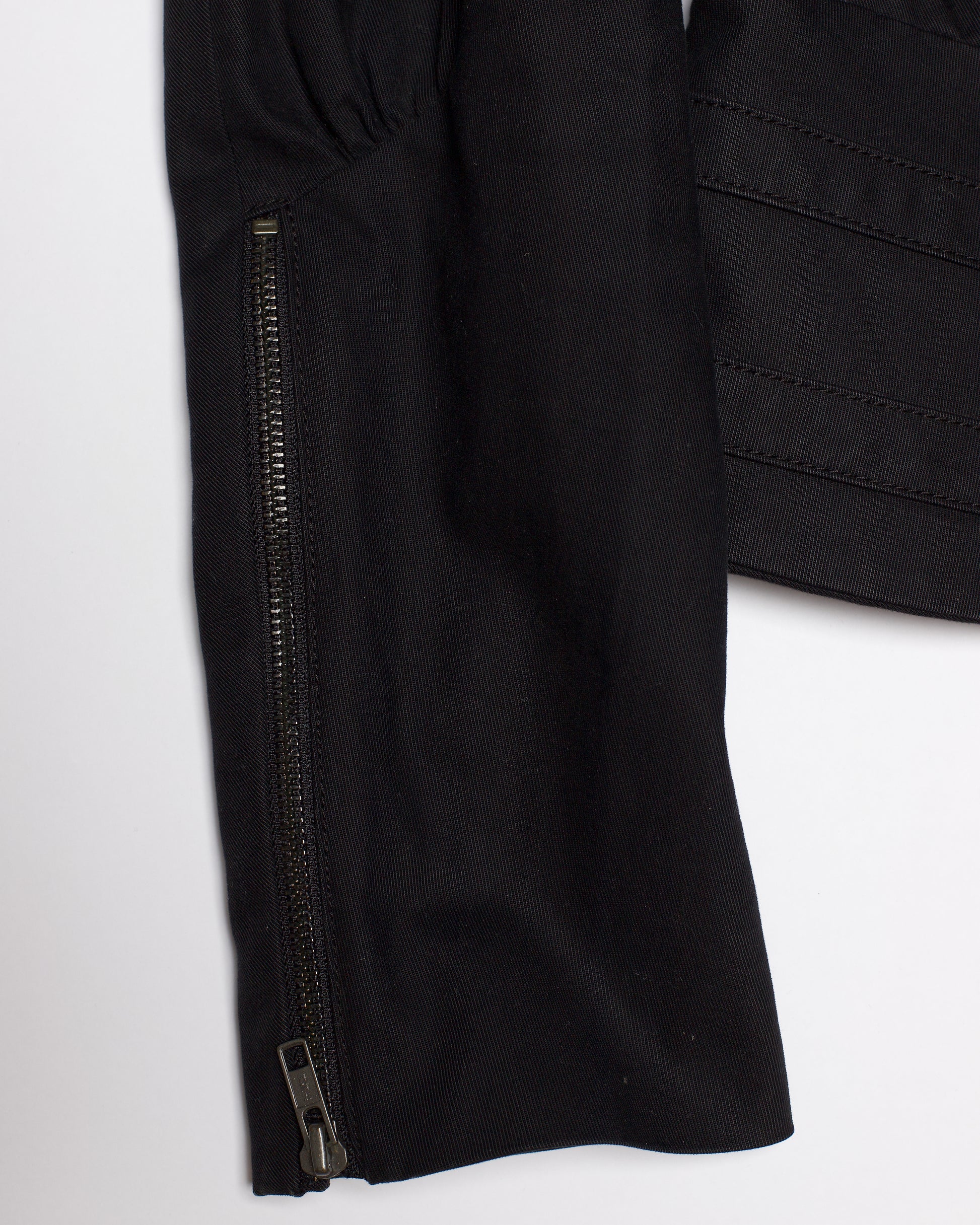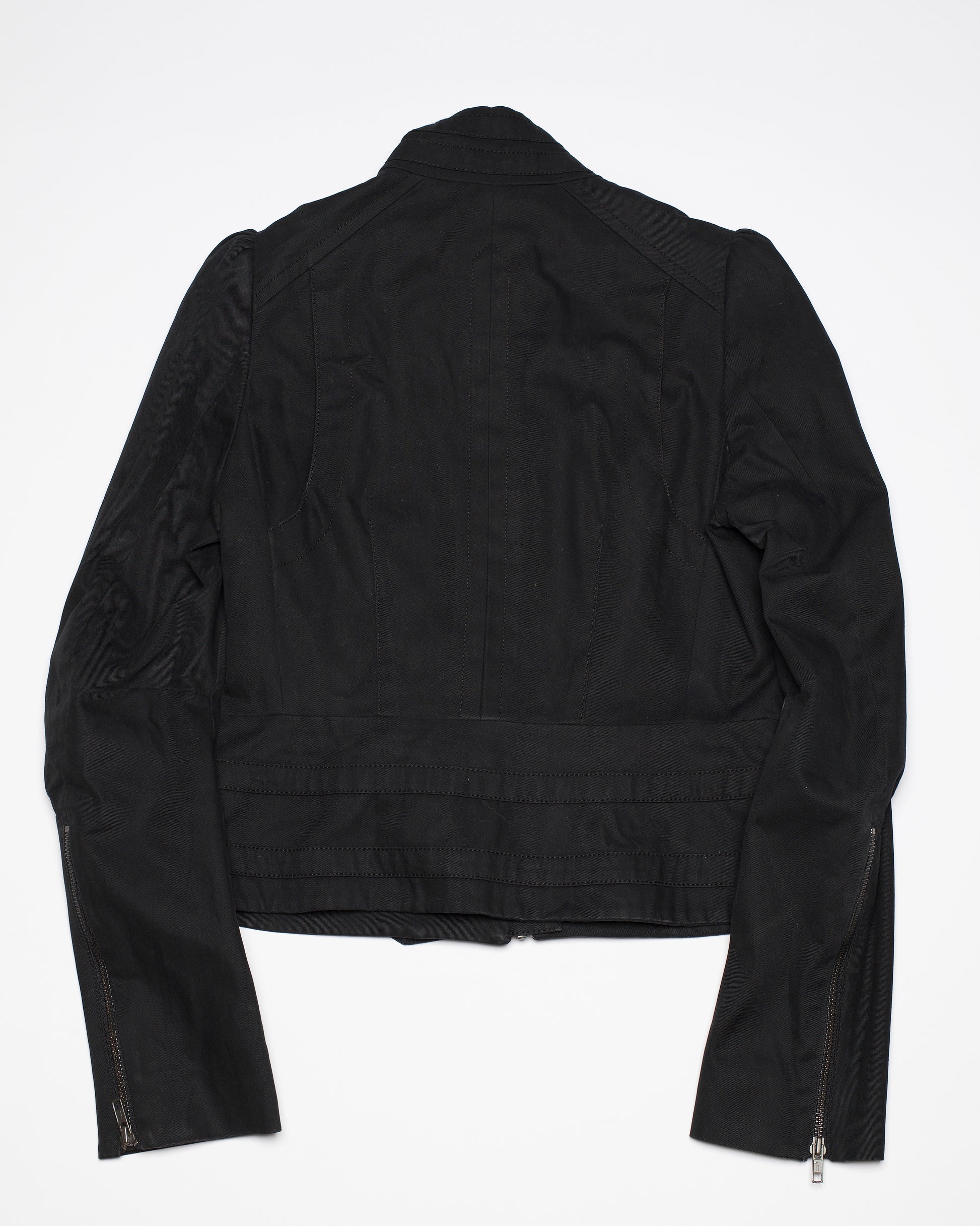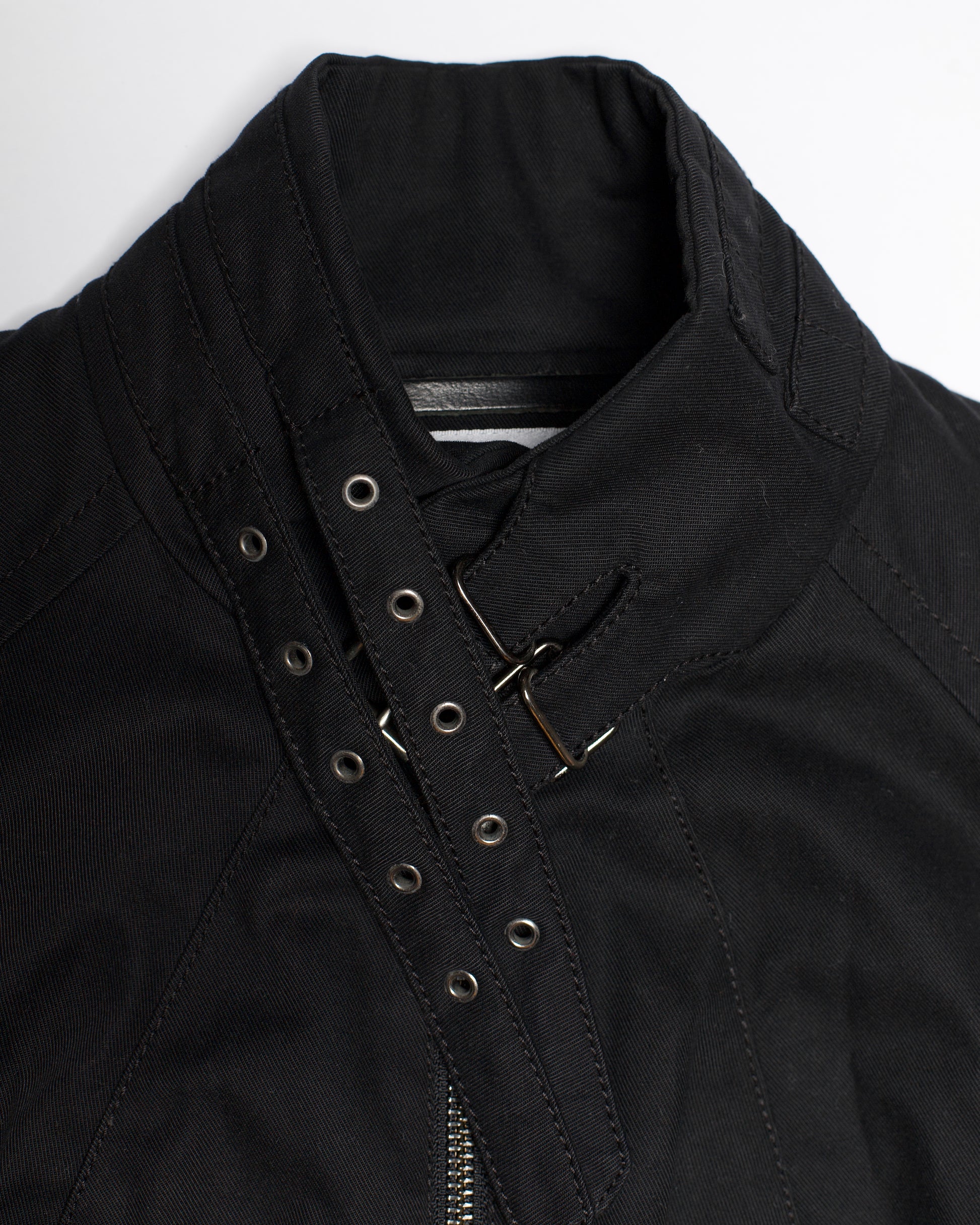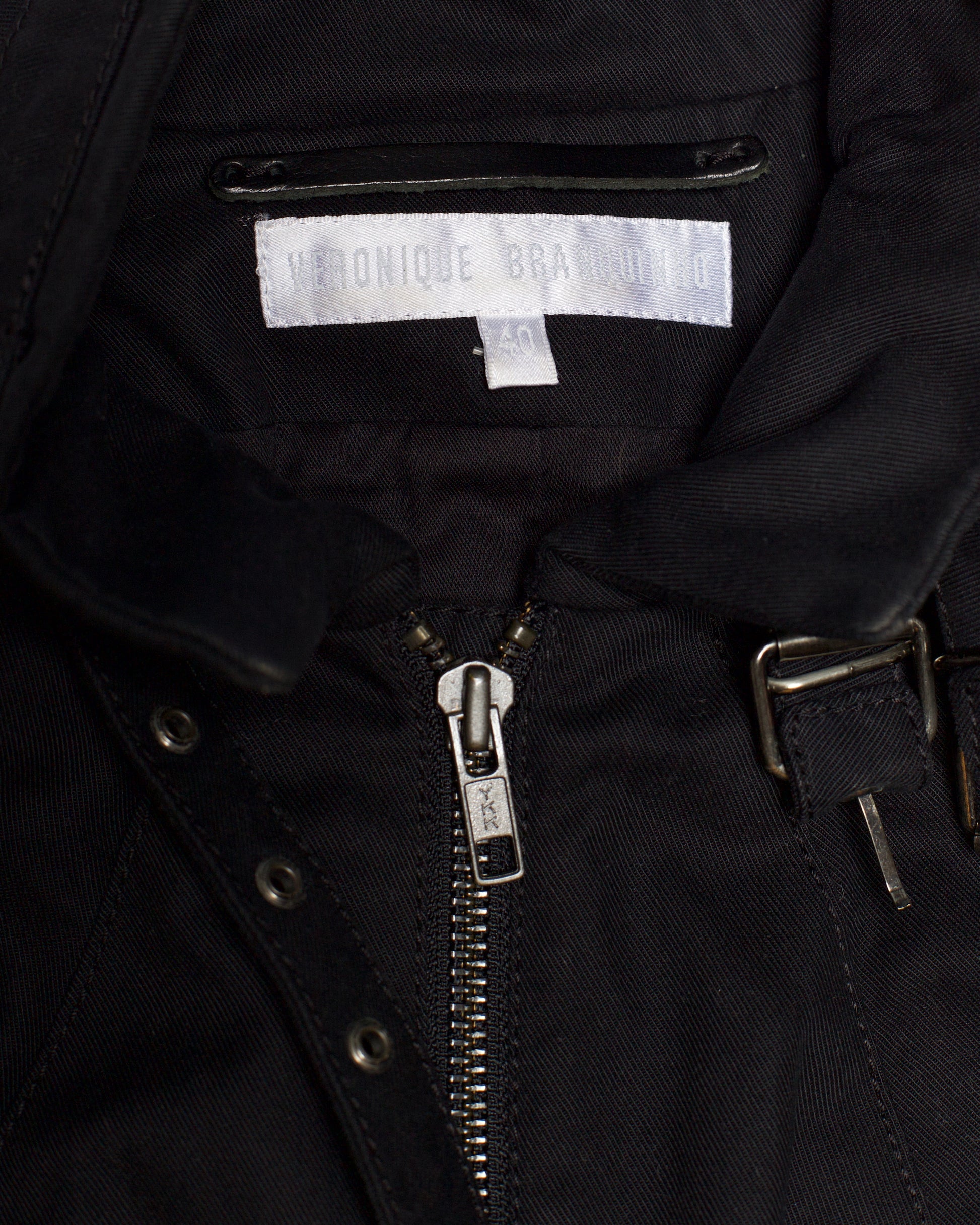 Veronique Branquinho bondage style zip jacket from her Autumn-Winter 2004 collection. The jacket features structured, exaggerated shoulders and extended, flared sleeves, signature to Branquinho’s long-running emphasis on gothic-romantic tailoring and silhouettes. Double waist and neck belts add for adustable fits, and provide elements of punk and bondage to the jacket as well.