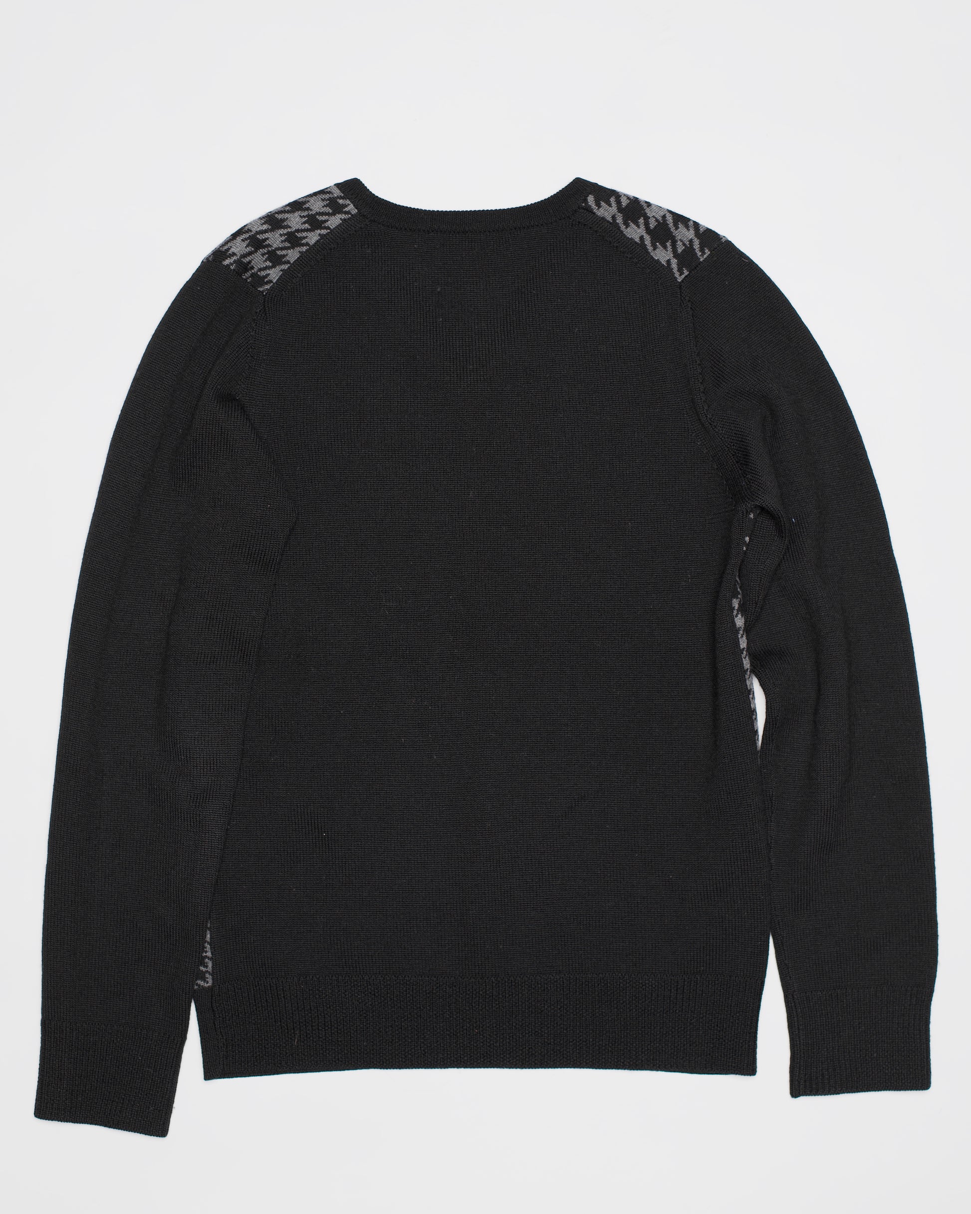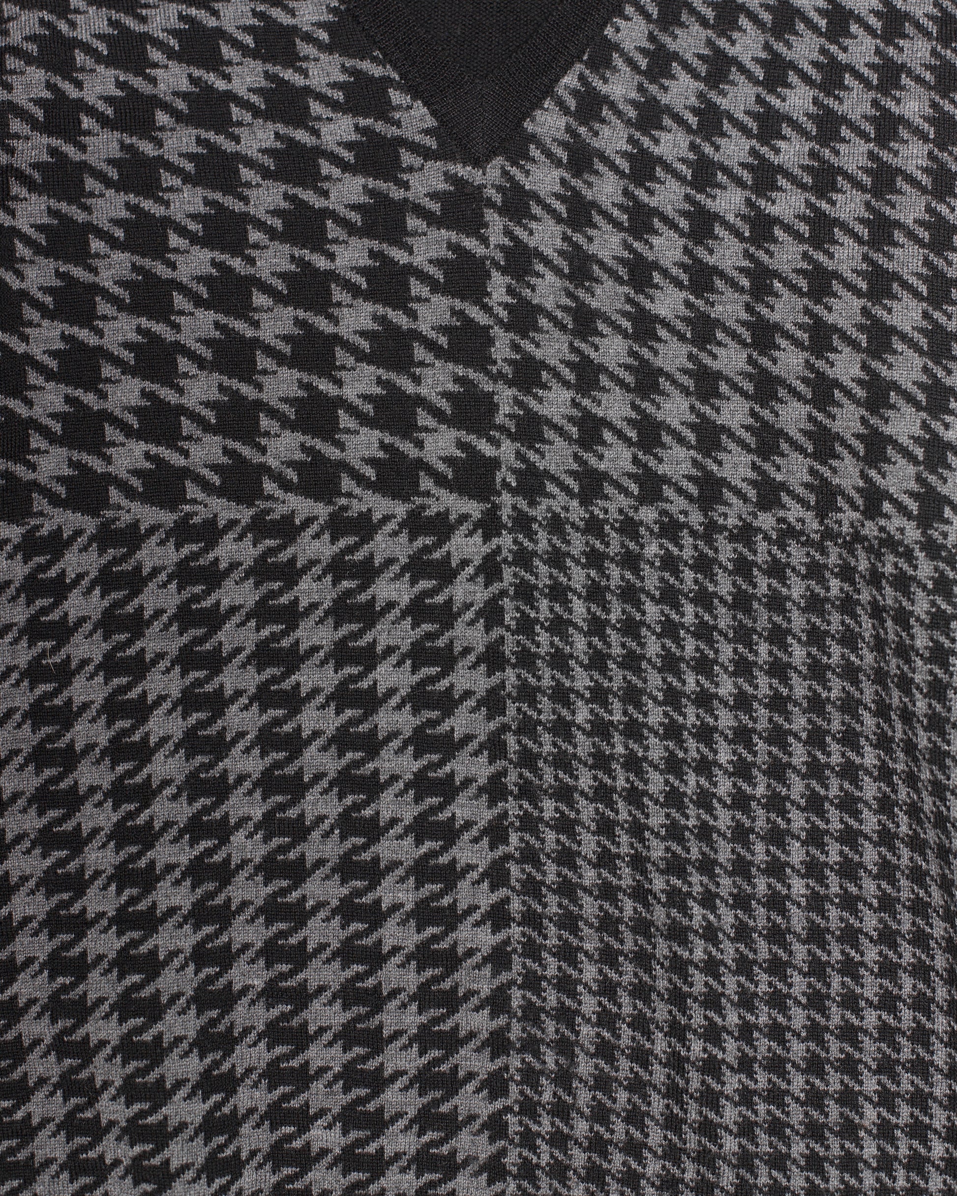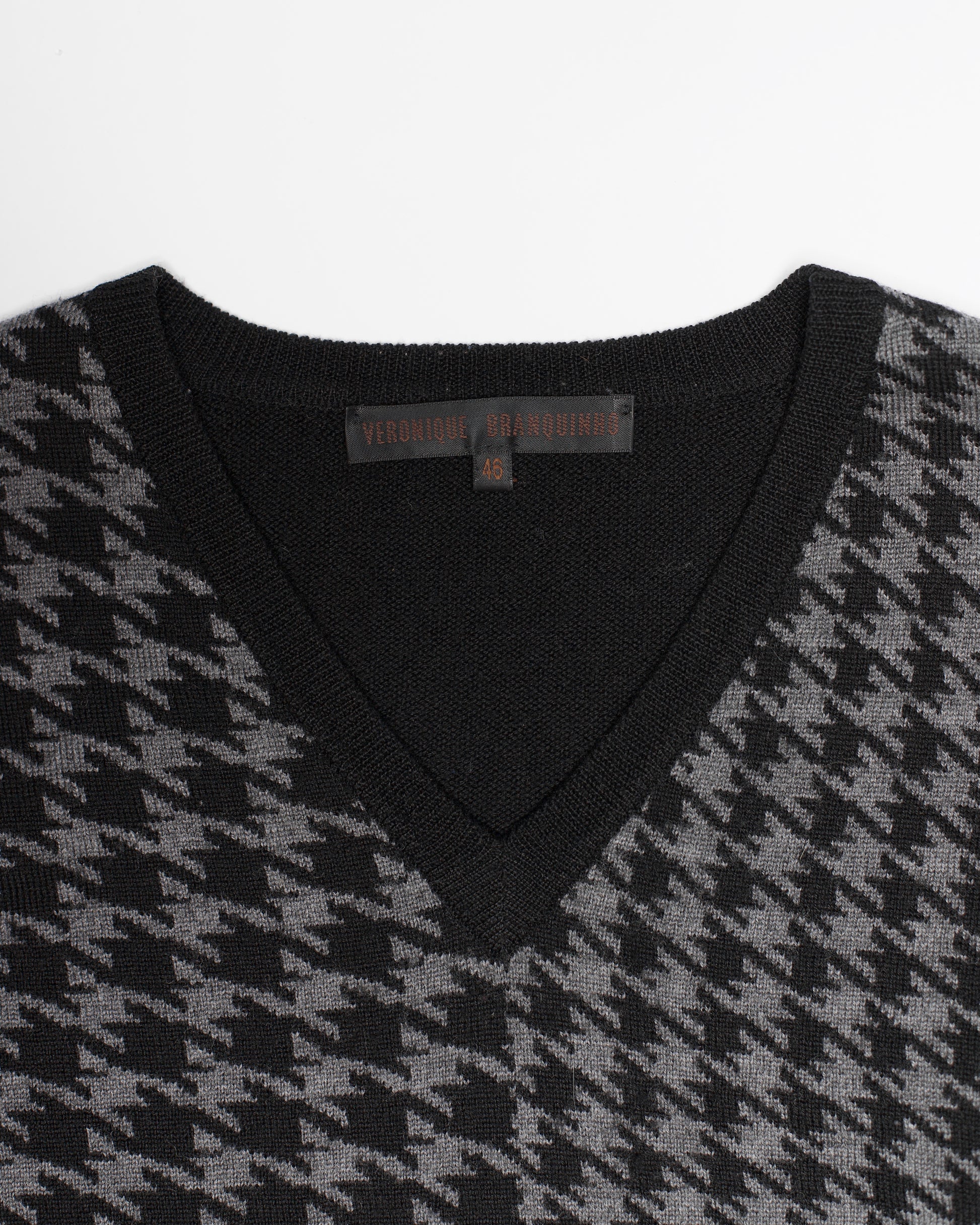 Wool houndstooth patterned v-neck knit from Veronique Branquinho. In line with her typical casual and highly wearable knits for men, the garment echoes patterns and cuts implemented throughout her main menswear production period of 2003-2008.