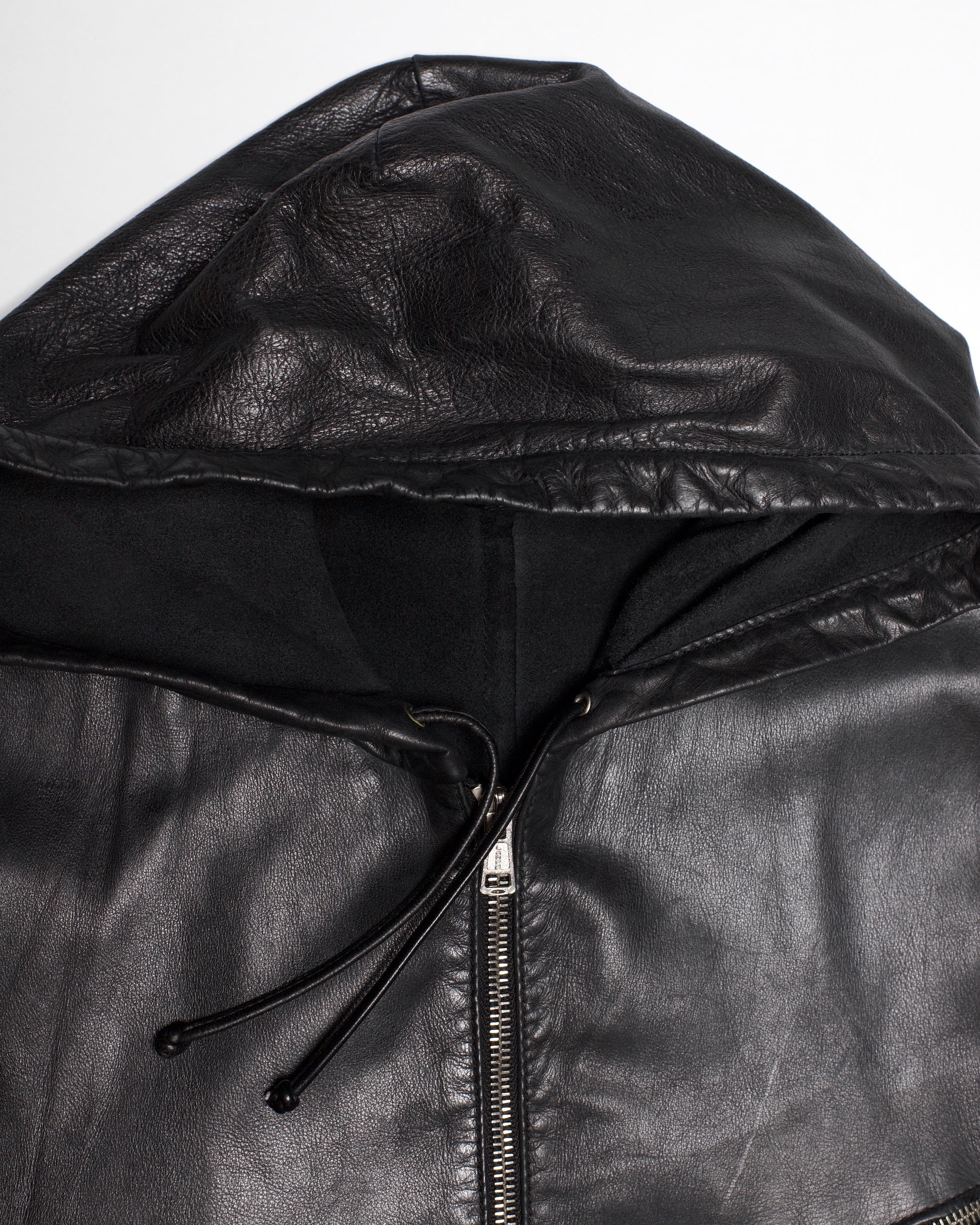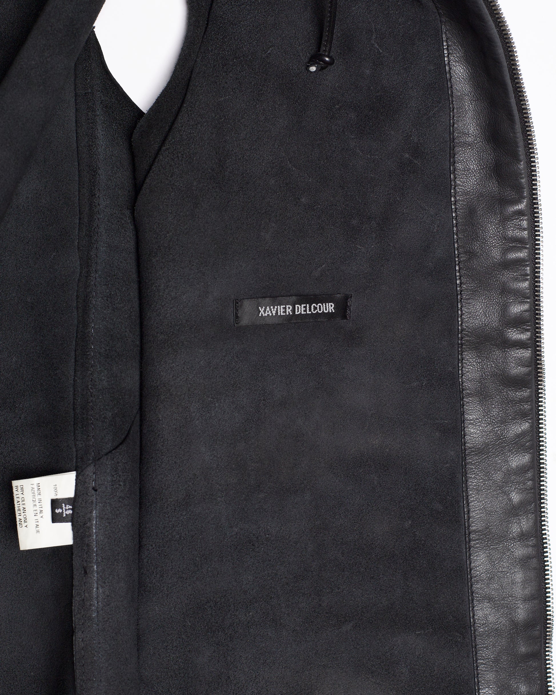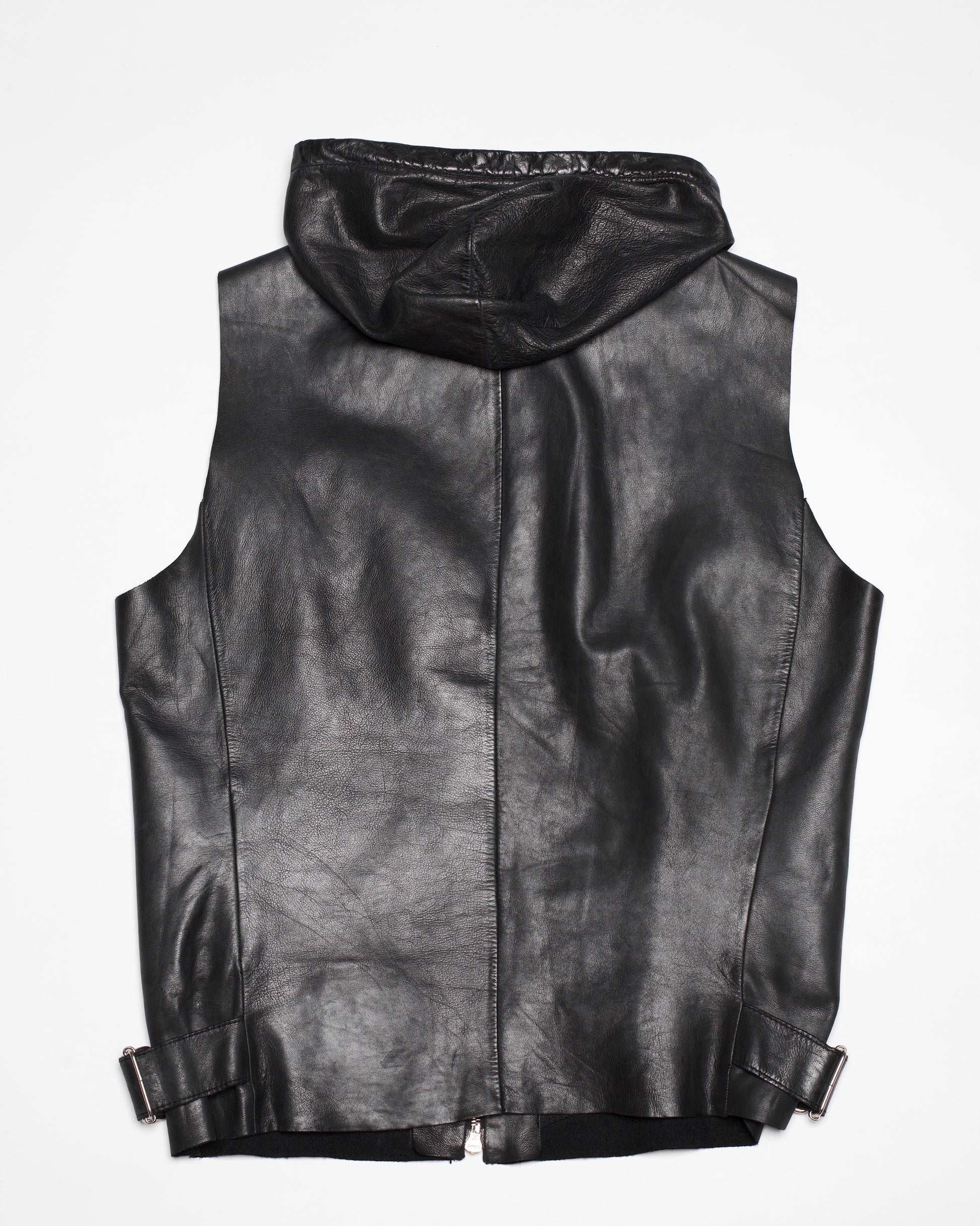 Xavier Delcour hooded leather moto-style vest from the mid-2000s. Crafted from an incredibly supple calf leather, the vest has a luxurious hand-feel, and fits slim and contoured to the body; adjustable straps on either side allow for slight modulation.