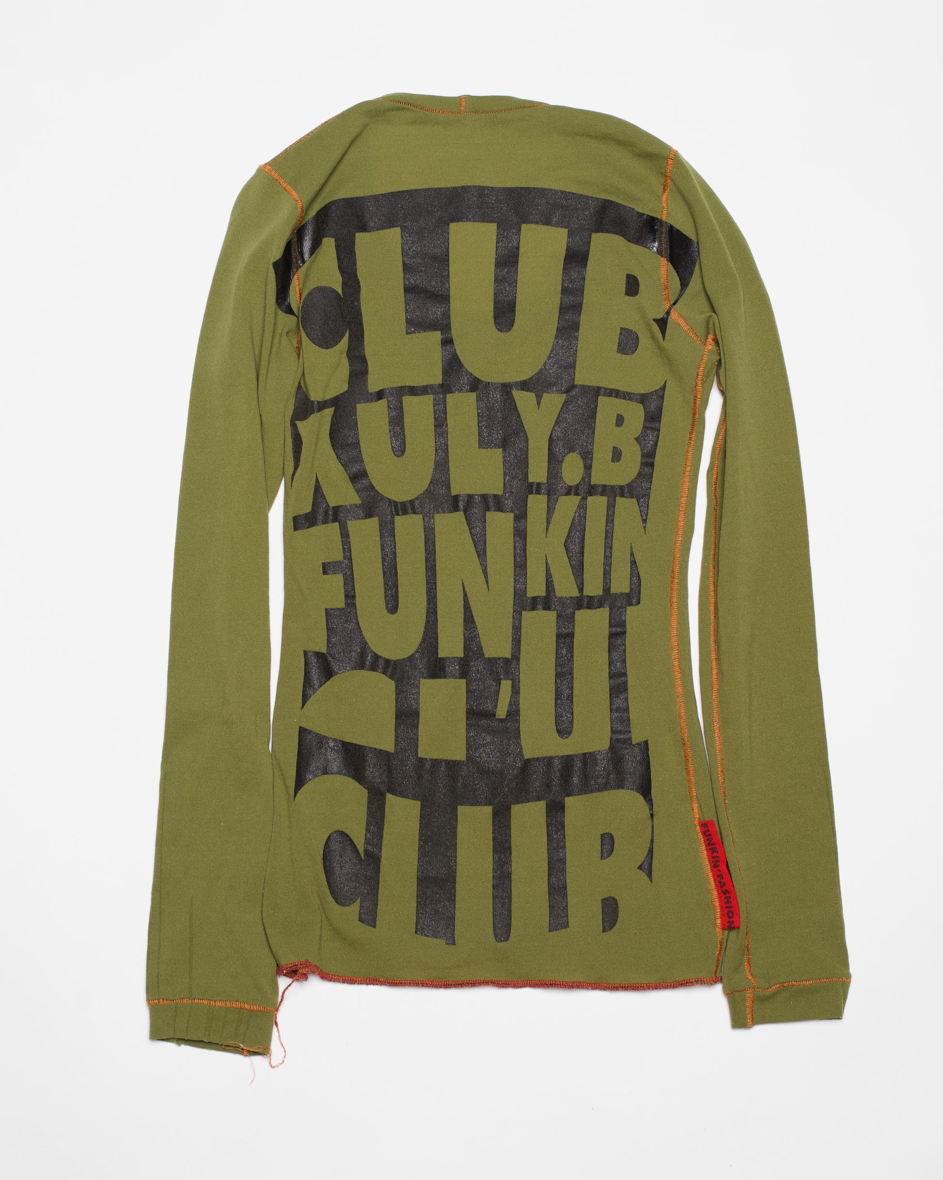 90s-era Xuly Bët top featuring front and back-side graphics of the designer's signature 'Funkin' Fashion Factory' typographic logo. The garment is made from upcycled stocking material with exposed, color contrasting surge stitching.