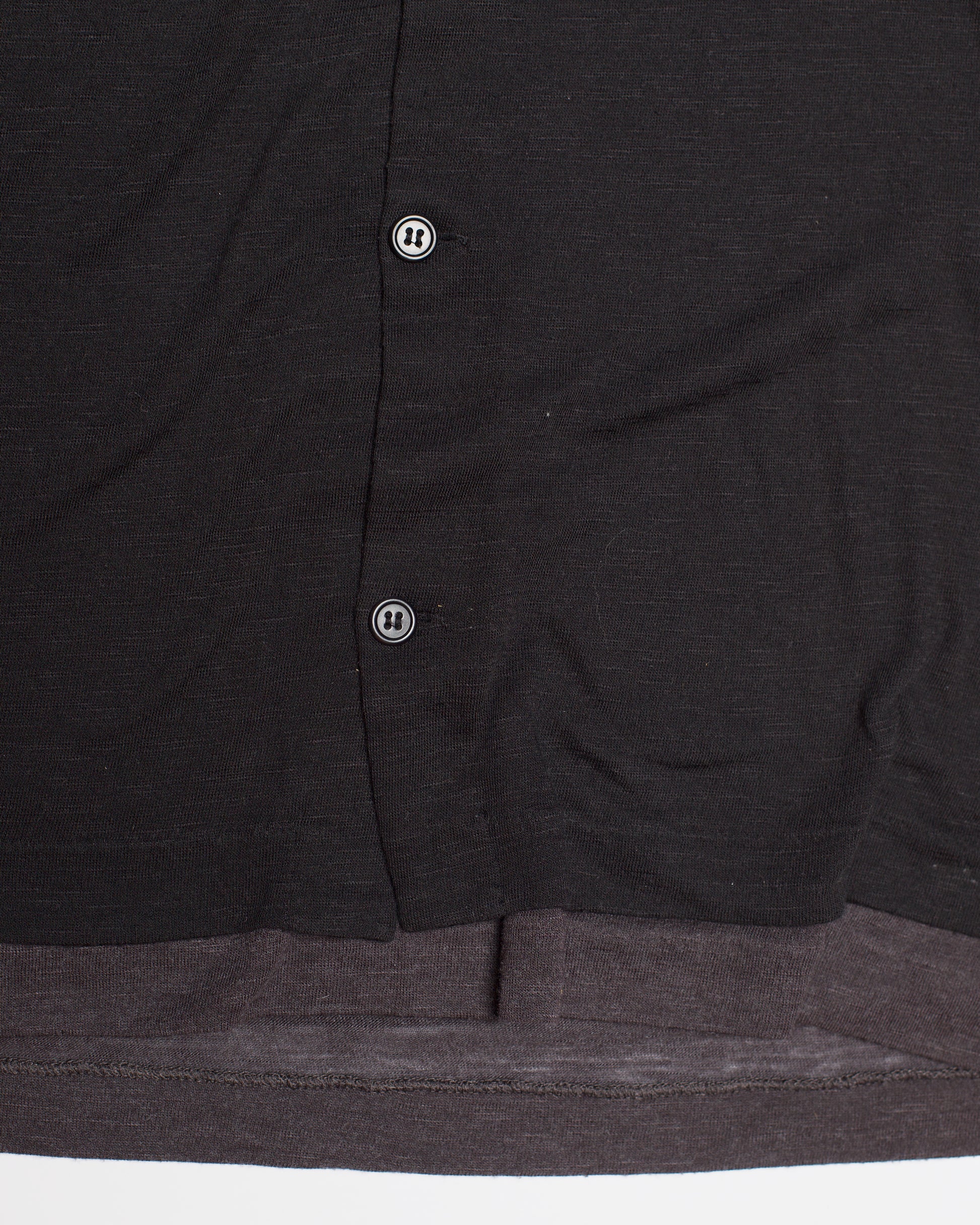 An inventive short-sleeve top from Yohji Yamamoto, showcasing the designer’s signature deconstructed layering. This top is constructed from two lightweight cotton knits, sewn together to create a doubled silhouette with dimensional drape. The outer layer features a cardigan-style button front, allowing for subtle styling shifts or open wear.