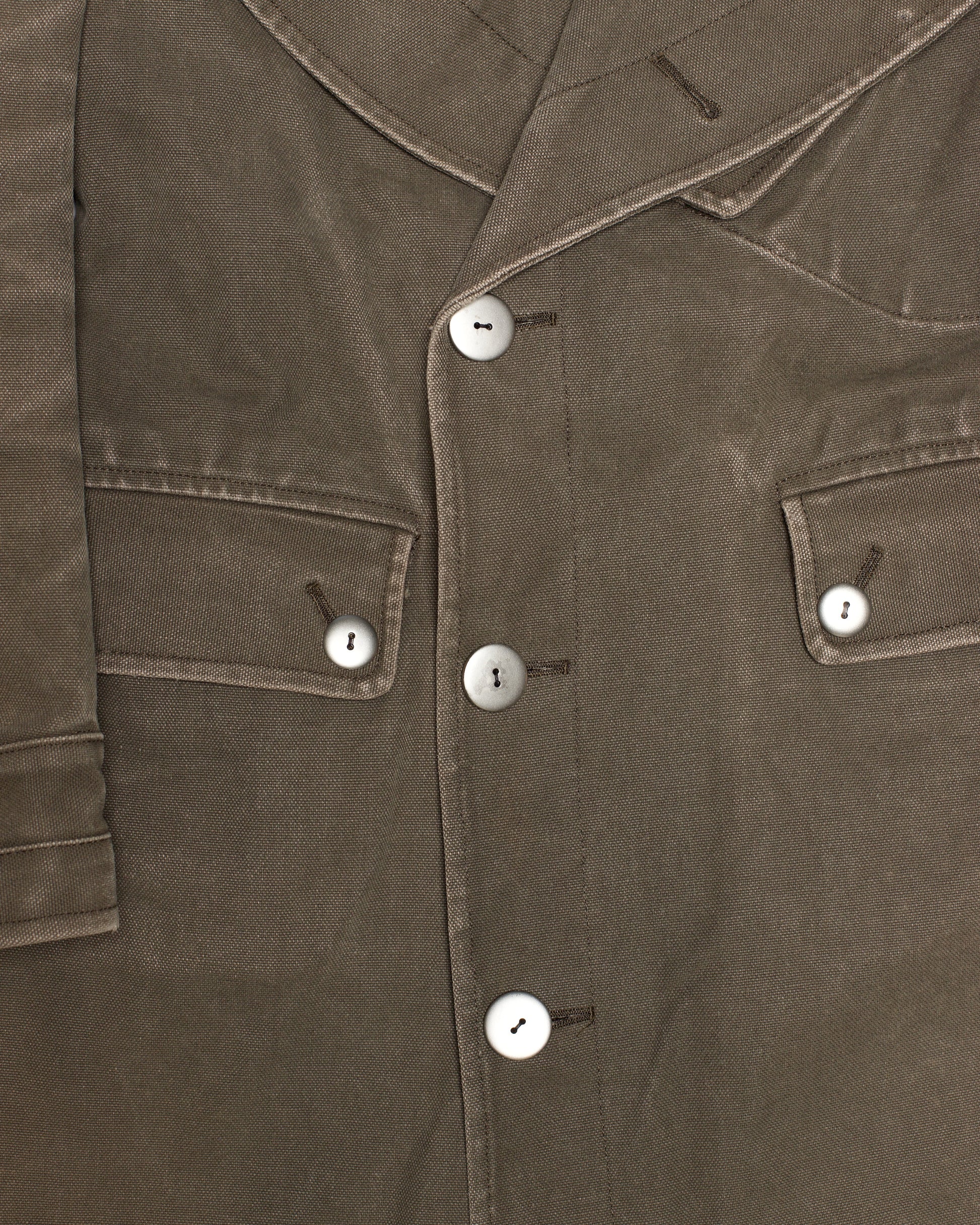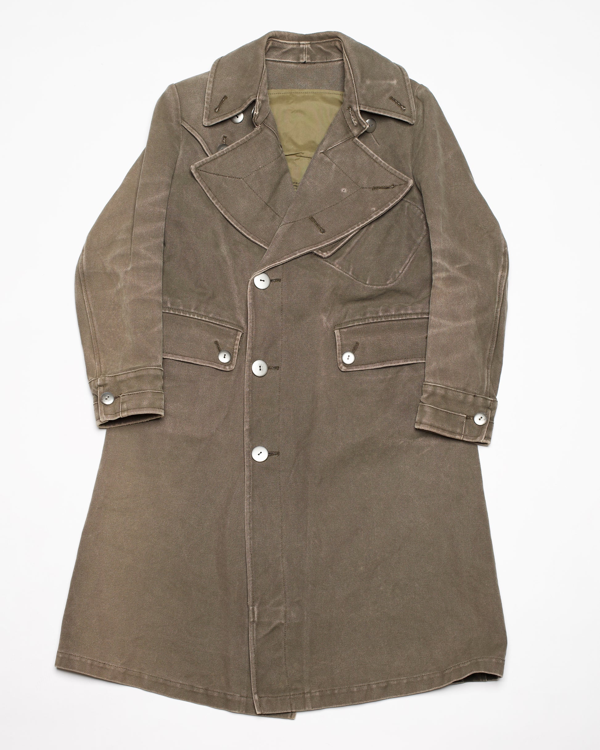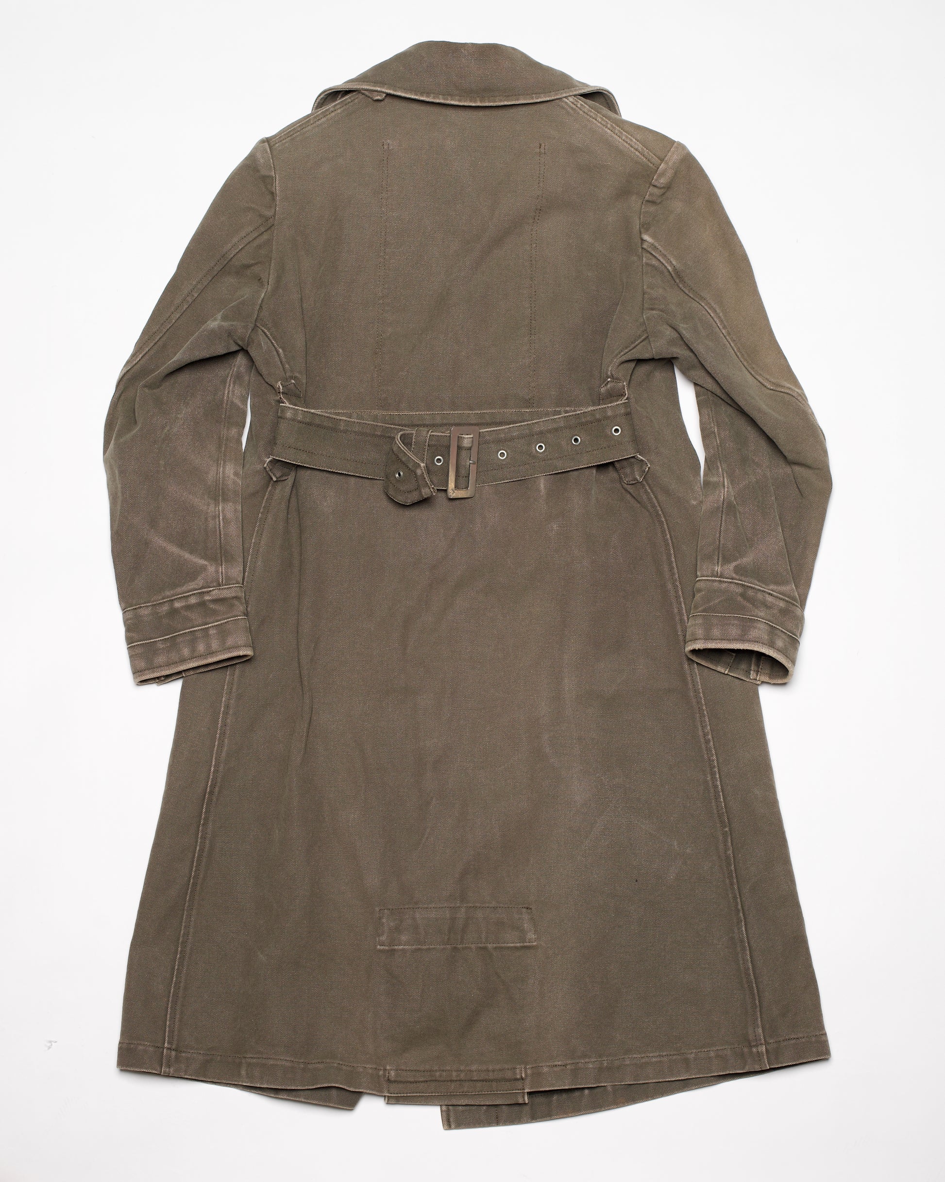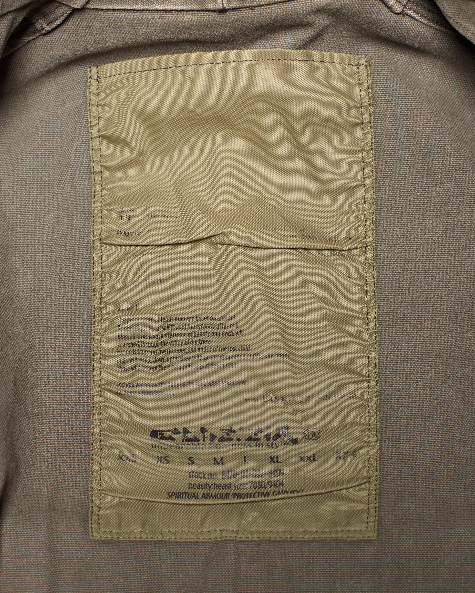 这款军装风衣出自宫下孝夫 (Takao Miyashita) 的 beauty:beast 及其姊妹品牌 clas:six。风衣采用厚实的棉帆布制成,军绿色的质地粗犷,带有工业风的质感和做旧效果,配有超大的棱角分明的口袋和银色对比纽扣。正如品牌标签所言,这件外套的最佳用途是“精神盔甲”。