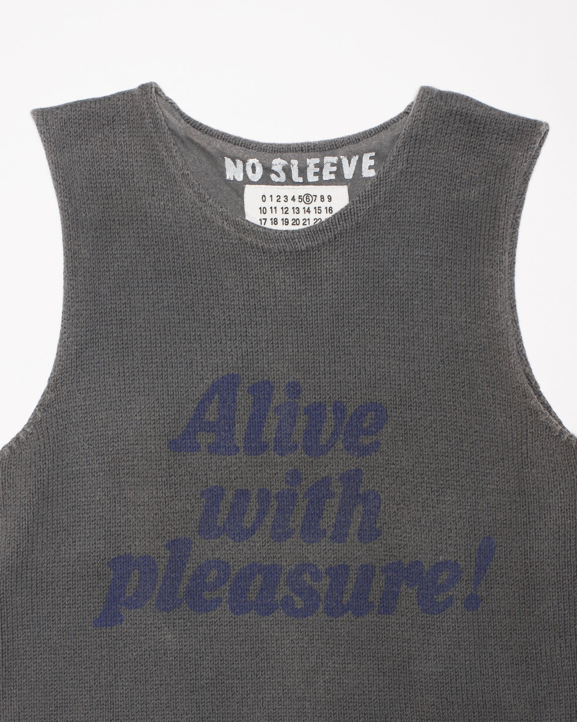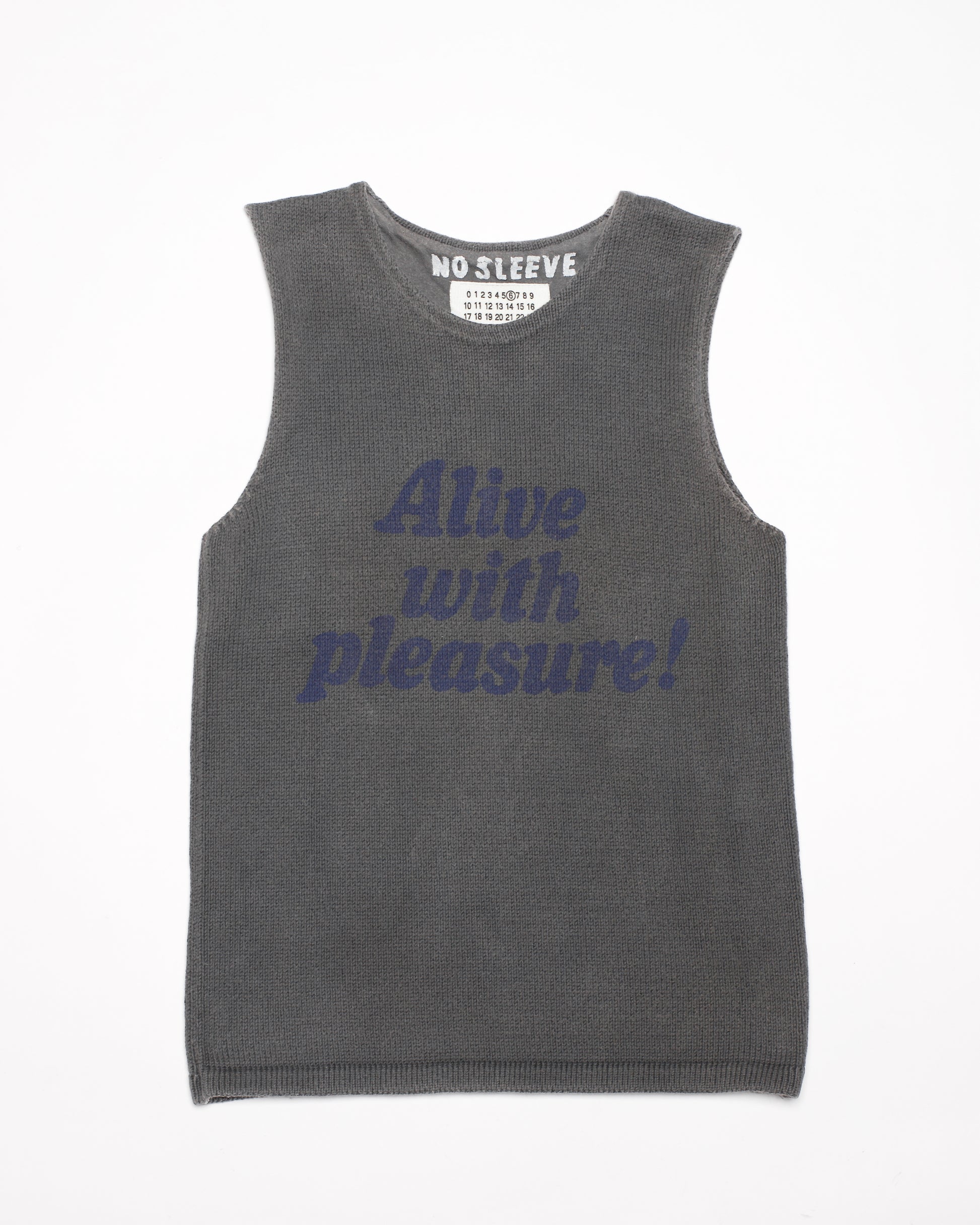 Martin Margiela Line 6 2002 年款针织棉背心。这款针织上衣巧妙地借用了美国 Newport 香烟的广告语“Alive with pleasure”,由 Margiela 的长期首席针织服装制作人 Miss Deanna 精心制作。