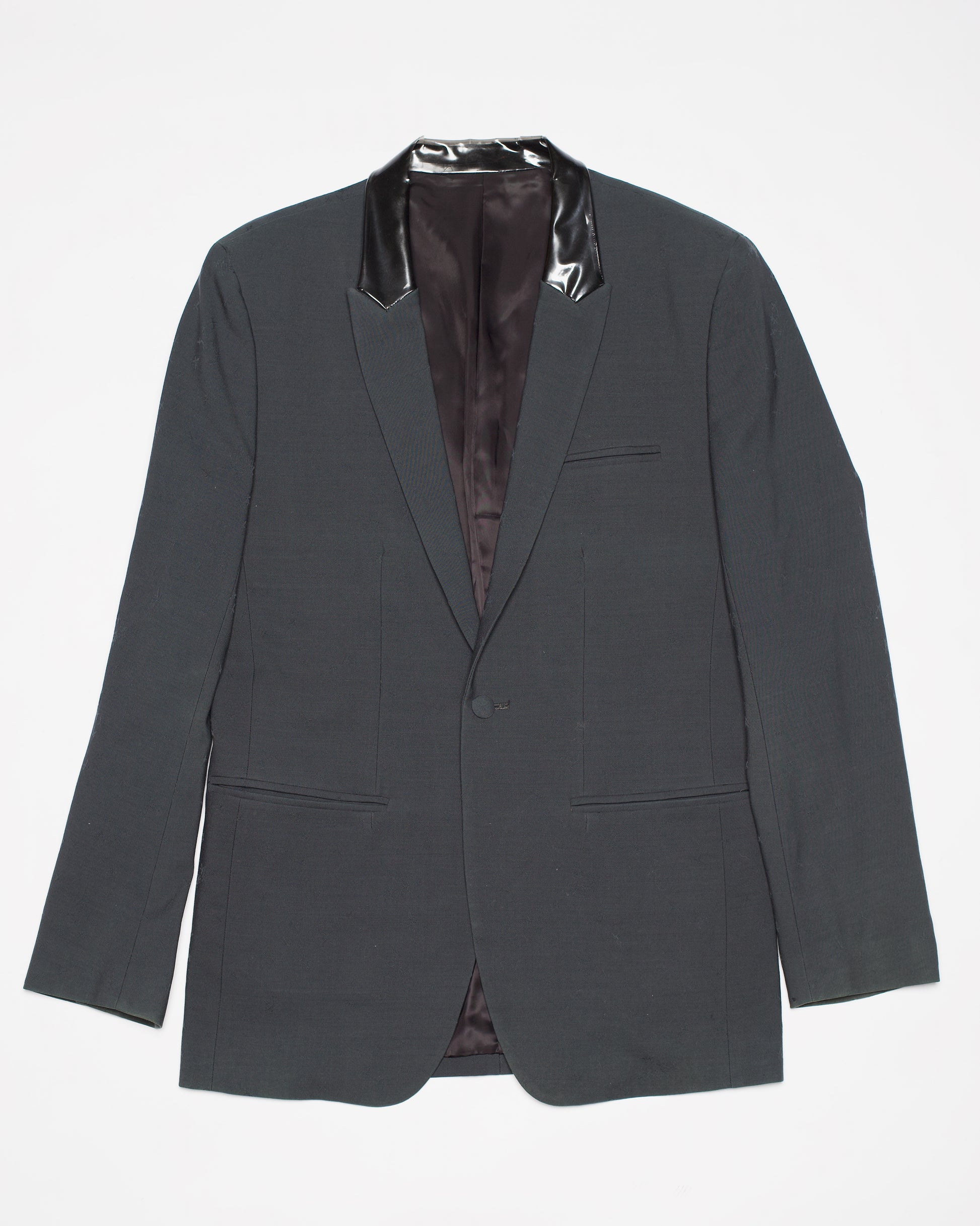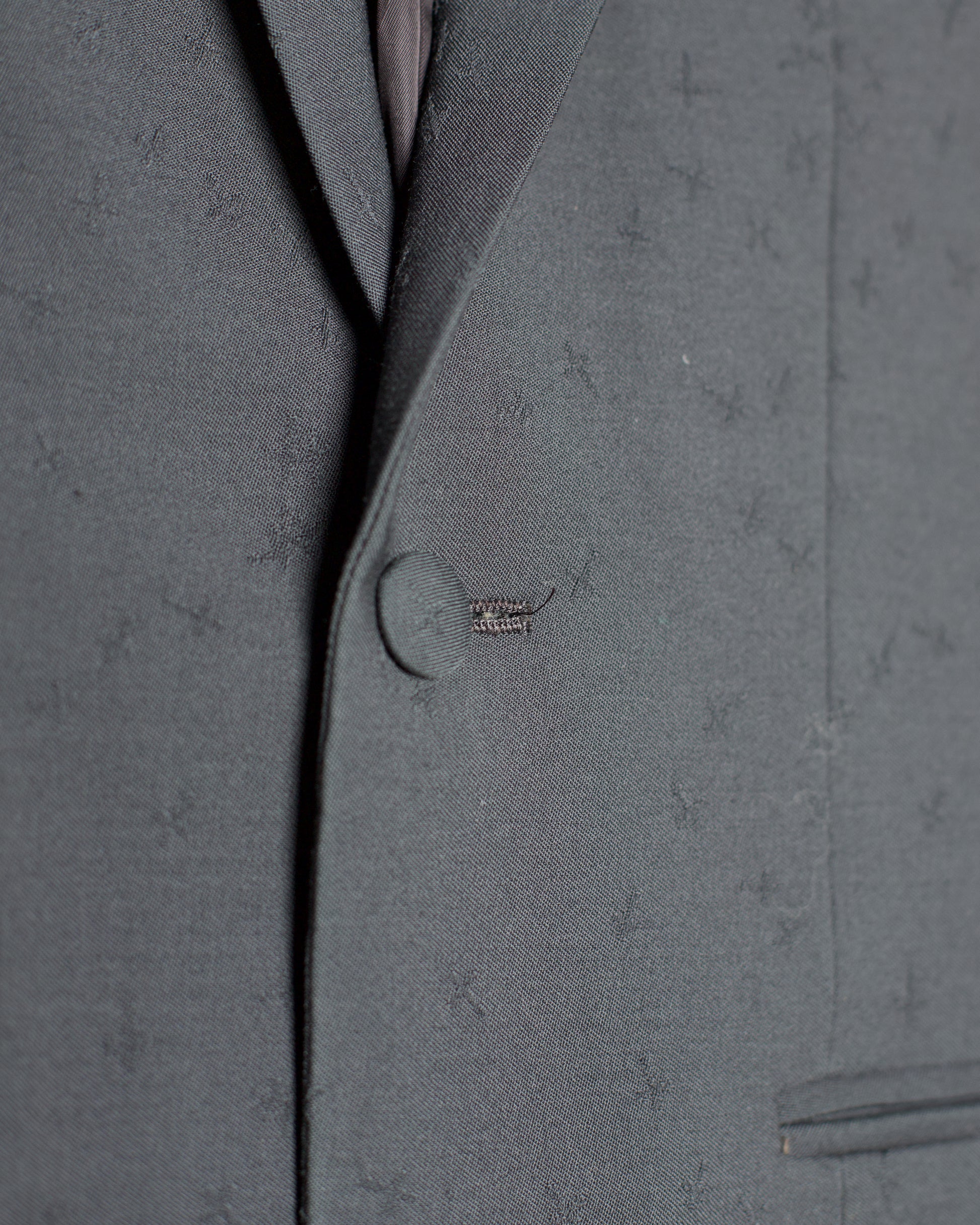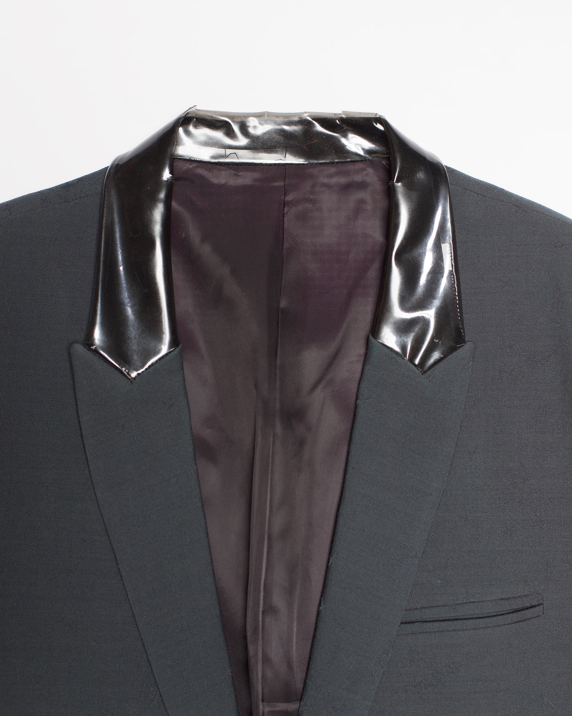 这款羊毛单扣西装外套出自 Undercover 备受赞誉的 2002/03 秋冬系列“女巫细胞分裂”(Witches Cell Division)。外套采用简洁的单扣设计,搭配 PVC 乙烯基撞色领,领口为尖领。内衬为奢华的酒红色面料,面料上点缀着数千个细小的十字架图案,这一设计元素贯穿整个系列的多个单品。