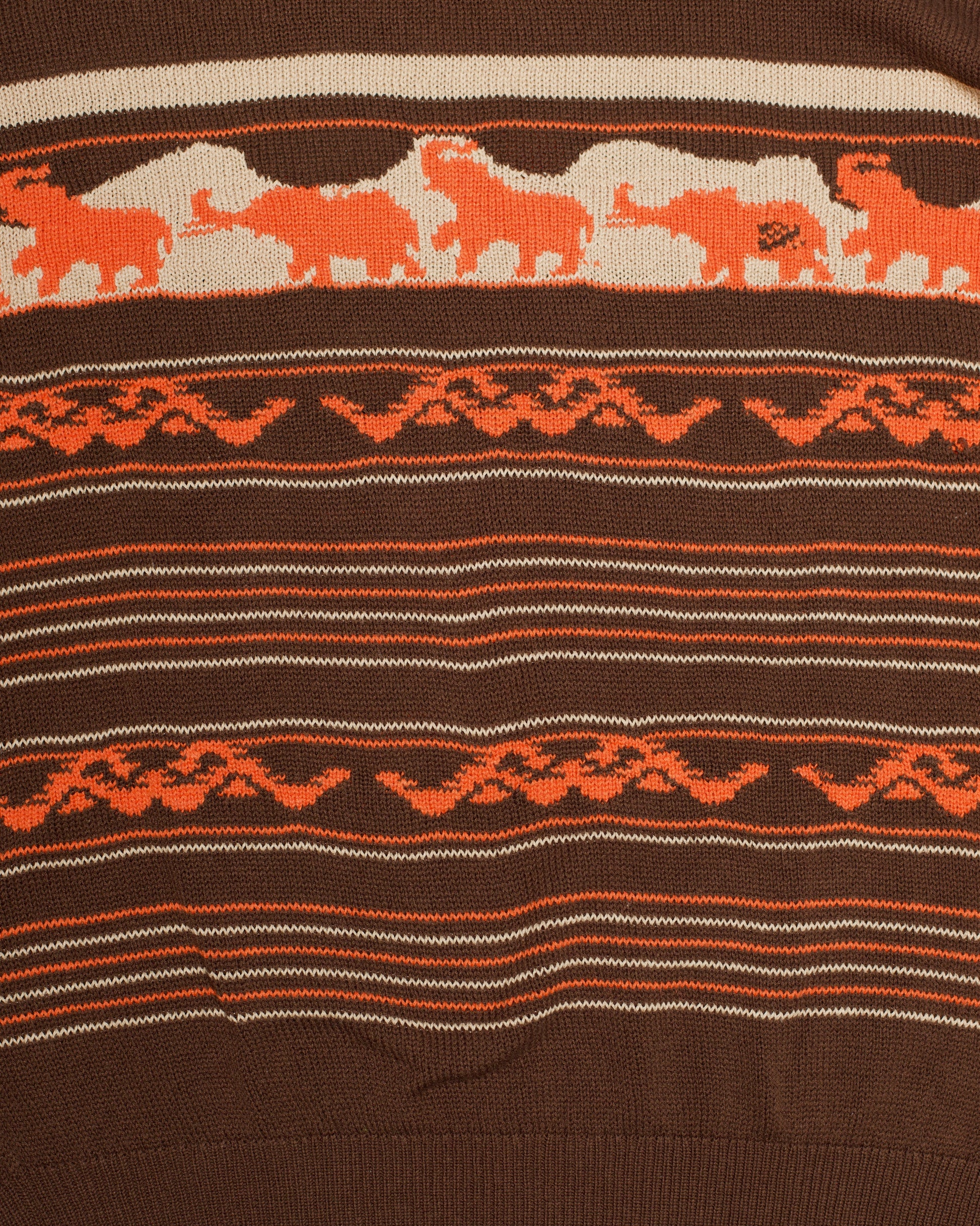 Undercover 1997春夏系列大象印花针织衫,出自高桥盾 (Jun Takahashi) 早期在东京设计的系列之一。这款针织衫采用棉涤混纺面料,轻盈透气,兼具耐穿性、挺括性和结构感,能够适应各种场合、环境和温度。针织衫饰有当季主打的大象图案和非洲撒哈拉沙漠风情,采用嵌花织法呈现。